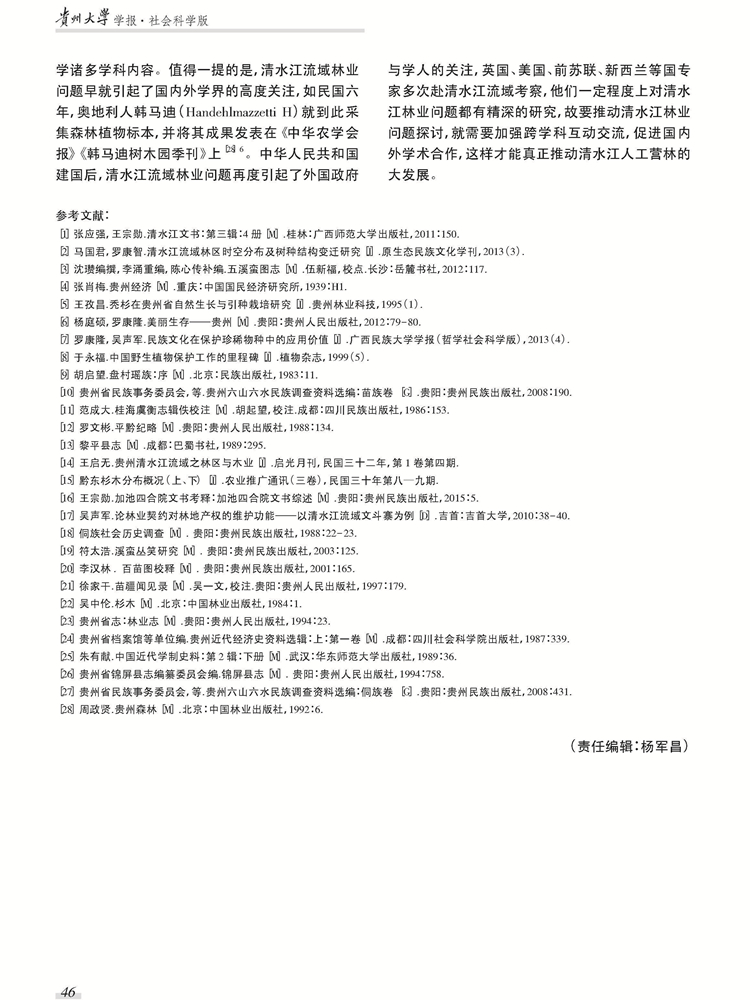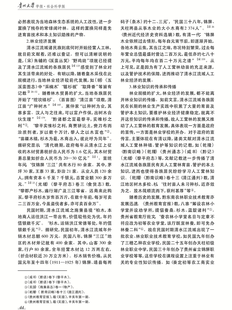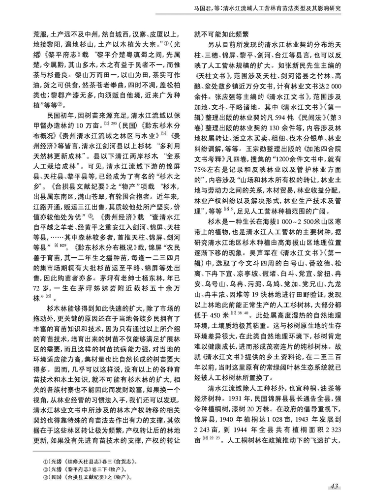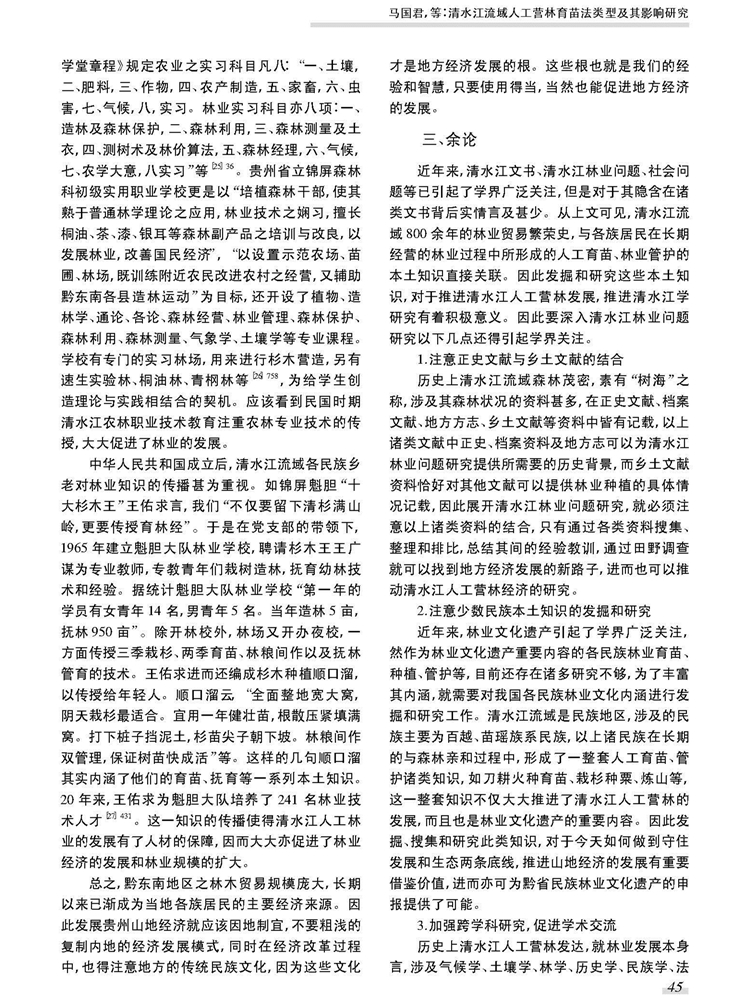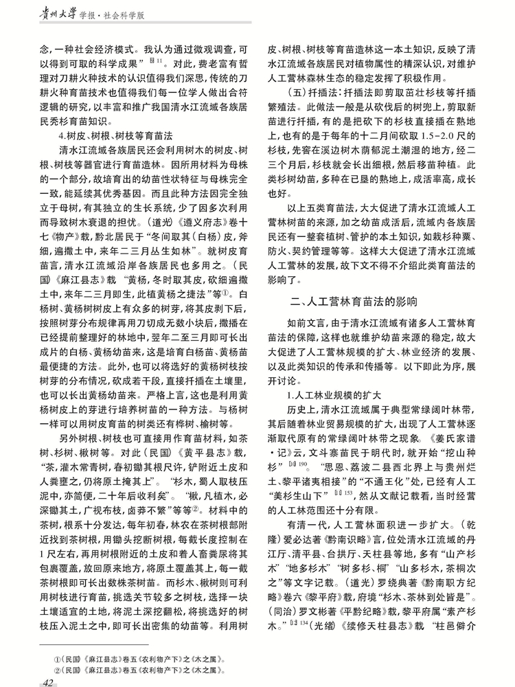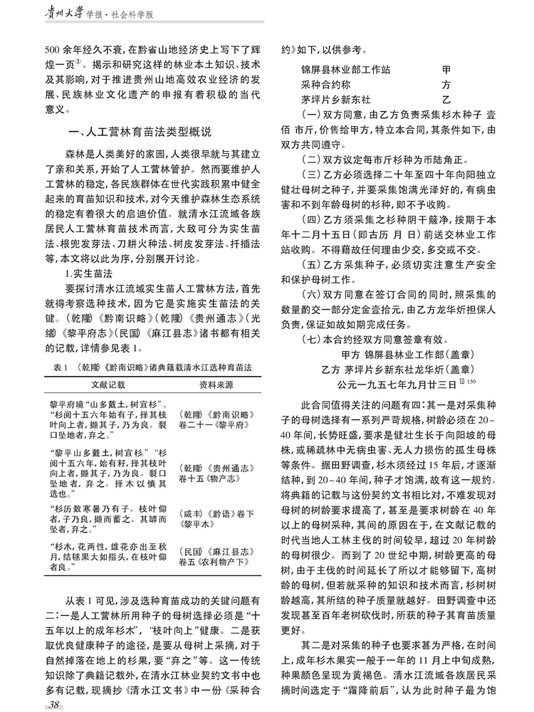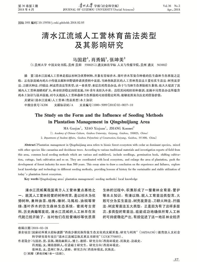 2018年4月第3卷第2期《贵州大学学报》(社会科学版)刊载贵州大学中国文化书院马国君教授等国家社科重大招标课题“西南少数民族传统生态文化的文献采集、研究与利用”(16ZDA156)、教育部人文社会科学研究青年项目“清水江流域宗族关系文书研究”(12YJC770055)研究成果,题:清水江流域人工营林育苗法类型及其影响研究。全文如下: