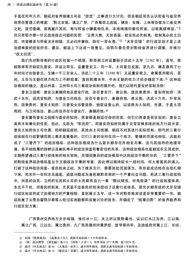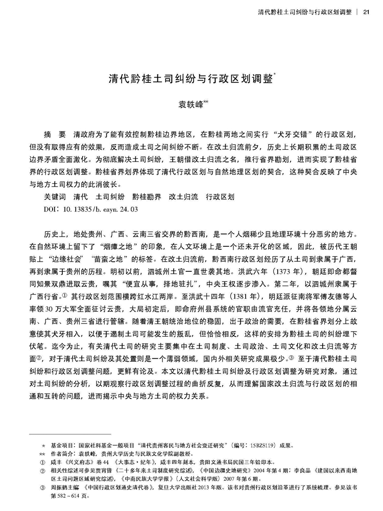 2017年12月第24辑《西南边疆民族研究》刊载贵州大学历史与民族文化学院(中国文化书院)历史系副教授袁轶峰博士国家社科基金一般项目“清代贵州客民与地方社会变迁研究”(编号:15BZS119)成果,题:清代黔桂土司纠纷与行政区划调整。全文如下: