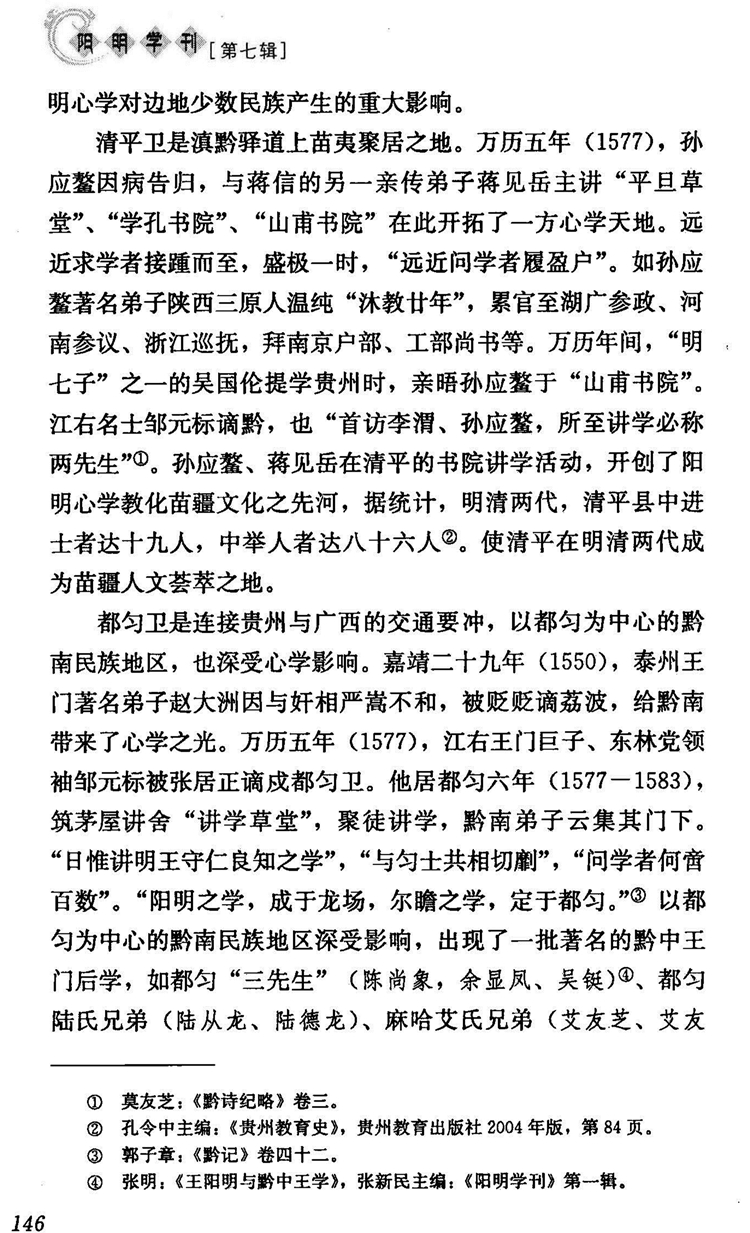 2015年第7辑《阳明学刊》刊载贵州大学历史与民族文化学院(中国文化书院)张明副教授国家社会科学基金项目“明清时期贵州阳明学地域学派研究”(07XZX004)、贵州大学人文社会科学科研项目“王阳明与黔中王门研究”(GDYB2010014)研究成果。论文,题:王阳明与黔中王门的书院讲学运动。全文如下: