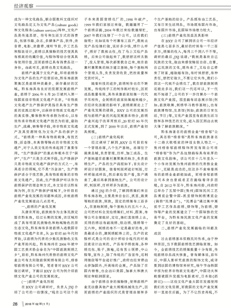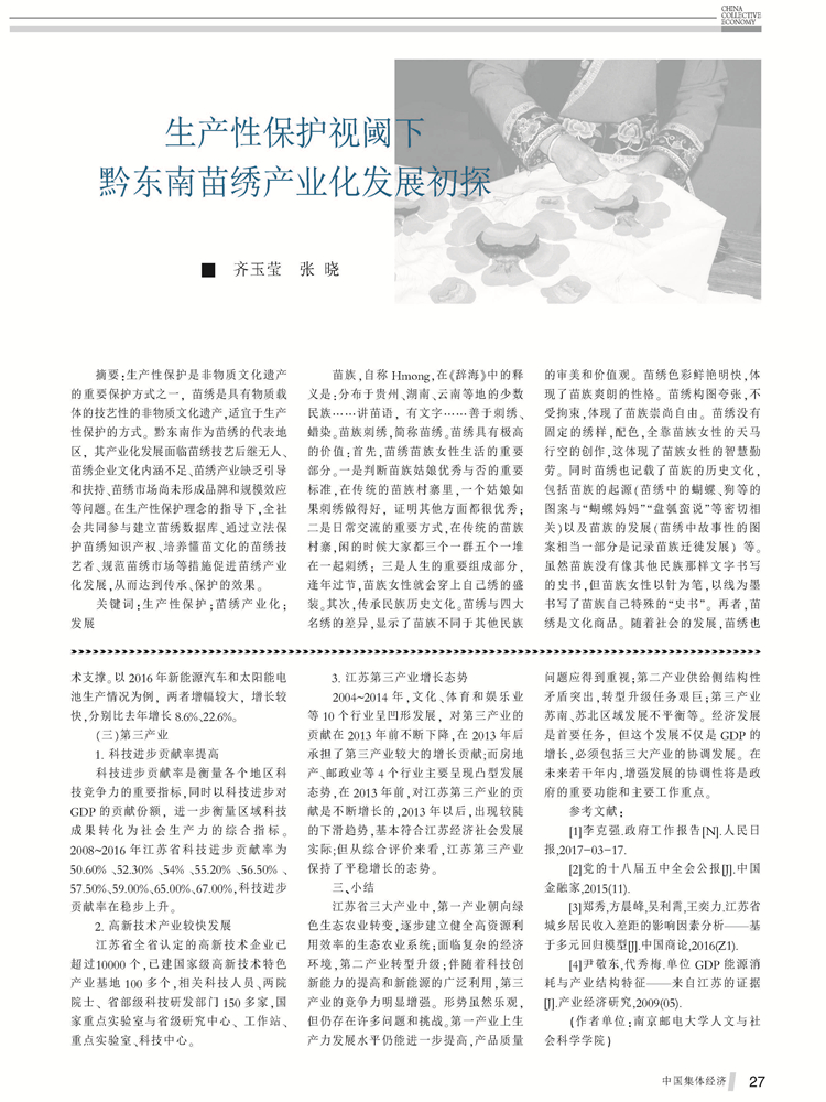2018年第2期《中国集体经济》刊载贵州大学历史与民族文化学院硕士研究生齐玉莹、历史与民族文化学院(中国文化书院)民族学中心张晓教授国家社会科学基金重大项目“世界苗学通史”(项目编号:15ZDB113)、贵州大学研究生创新基金项目“分工与配合:贵州惠水县‘敲巴郎’仪式性别研究”(项目编号:研人文2017012)的阶段成果,题:生产性保护视阈下黔东南苗绣产业化发展初探。全文如下:
