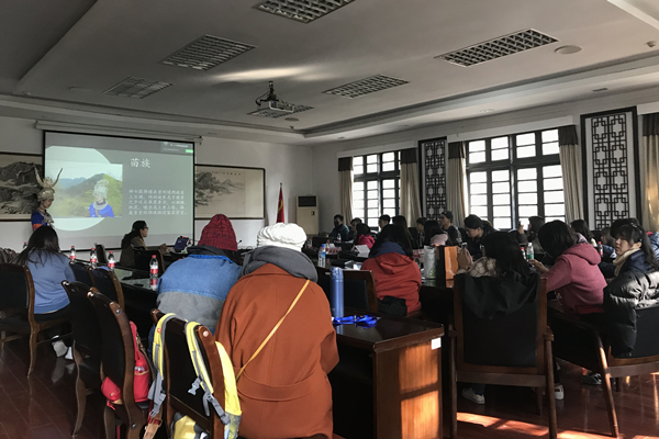 来自台湾彰化师范大学、树德科技大学、东海大学、高雄大学的师生们与贵州大学的同学共同听取本次讲座。讲座中,吴倩华副教授以“多彩贵州”作为切入,简明介绍了贵州多彩文化之由来与少数民族种类及其分布现况。紧接着,她详细讲解了苗族服饰传统,继而引出了讲座重点——贵州雷山西江苗族女盛装。