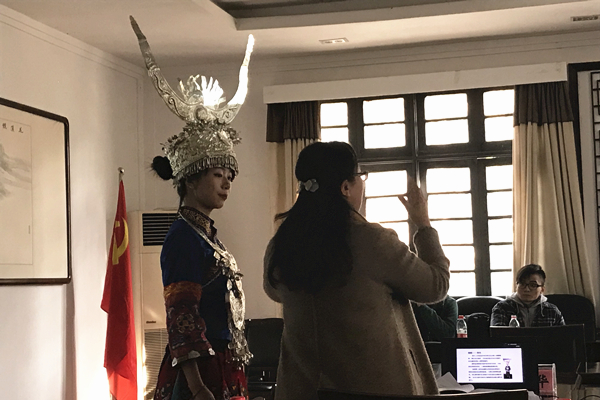 在详细讲述苗族女盛装各个部分的同时,吴倩华副教授还特意邀请其学生助理为在场师生生动展示了苗族女盛装的穿着效果,以学生模特为样例,详细分析了作为贵州苗族聚居地区雷山县西江千户苗寨的苗家绚丽多彩的女盛装服饰及其各个部分的来由演变、色彩搭配及其所体现的文化学符号特征与历史文化意义。