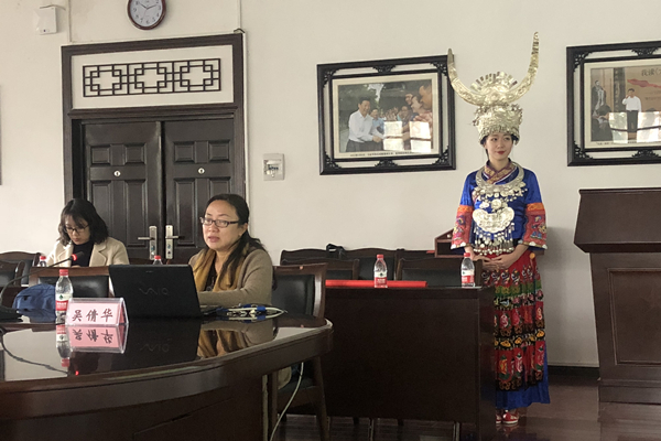 2018年11月23日,专门为来自台湾高校学生举行的“贵州少数民族文化探访”冬令营专题讲座在贵州大学行政楼一号会议室举行。贵州大学历史与民族文化学院(中国文化书院)苗族女博士吴倩华副教授为同学们主讲“贵州少数民族文化与历史——绝代风华,独领风骚:雷山西江苗族女盛装”。