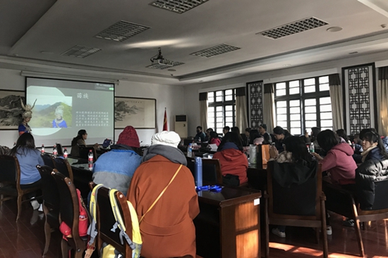 我校历史与民族文化学院(中国文化书院)吴倩华副教授在北校区一号行政楼一号会议室作题为“贵州少数民族文化与历史——绝代风华,独领风骚:雷山西江苗族女盛装”的讲座,台湾师生们与我校学生代表到场聆听。