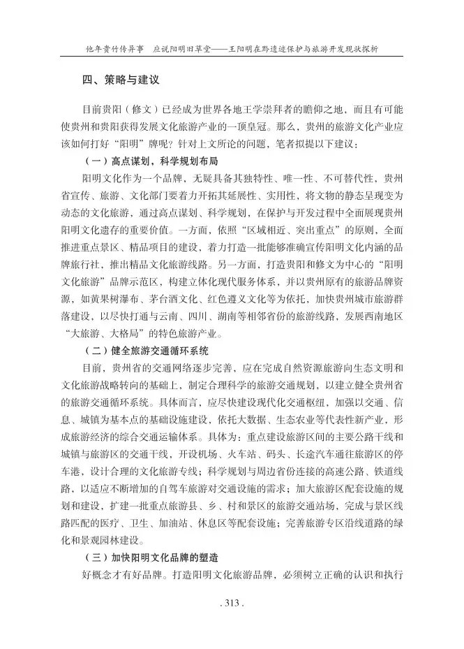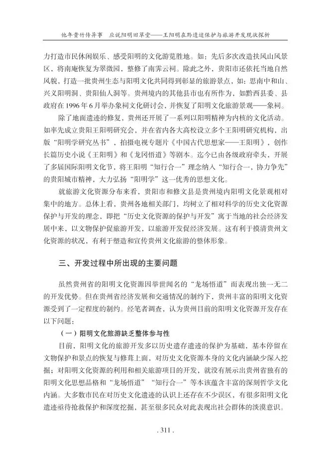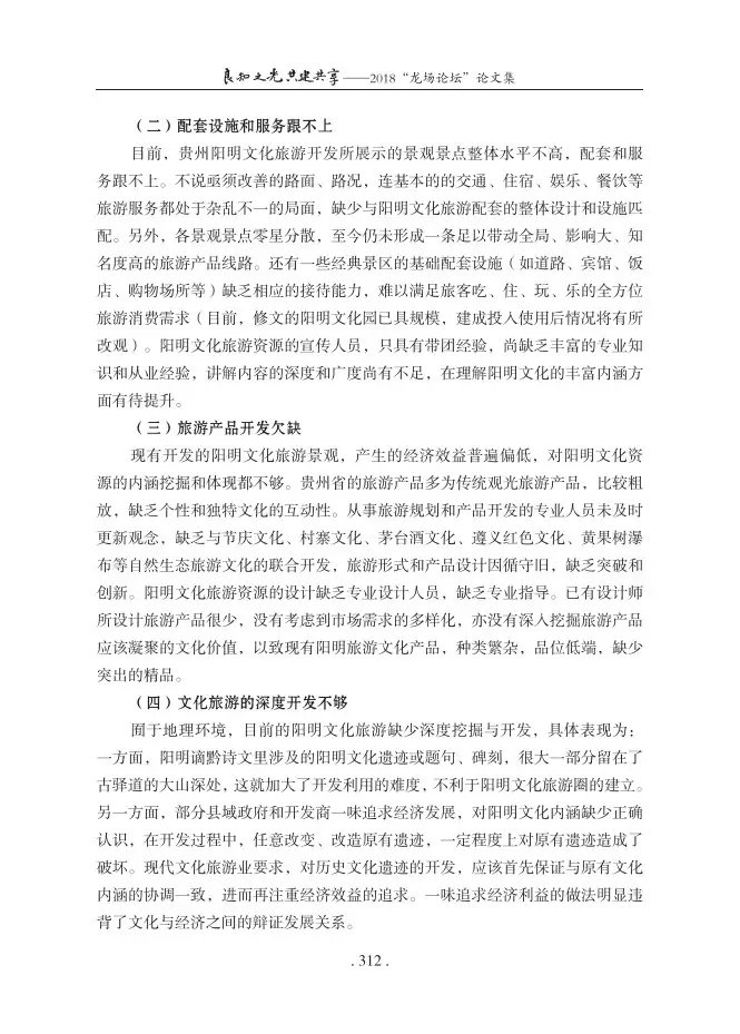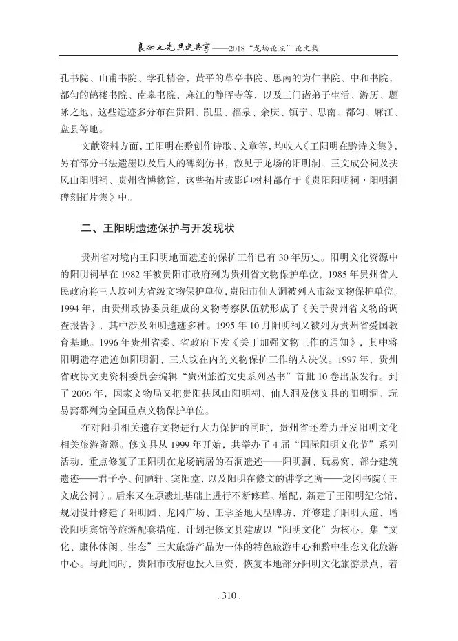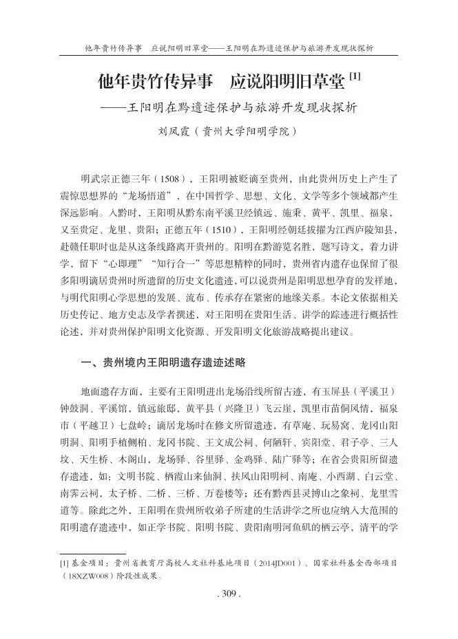 贵州大学阳明学院刘凤霞副教授贵州省教育厅高校人文社科基地——贵州大学中华传统文化与贵州地域文化研究中心项目(2014JD001)、国家社科基金西部项目(18XZW008)阶段性成果并提交文化节论坛论文收入《良知之光·共建共享——2018“龙场论坛”论文集》,题:他年贵竹传异事应说阳明旧草堂——王阳明在黔遗迹保护与旅游开发现状探析。全文如下: