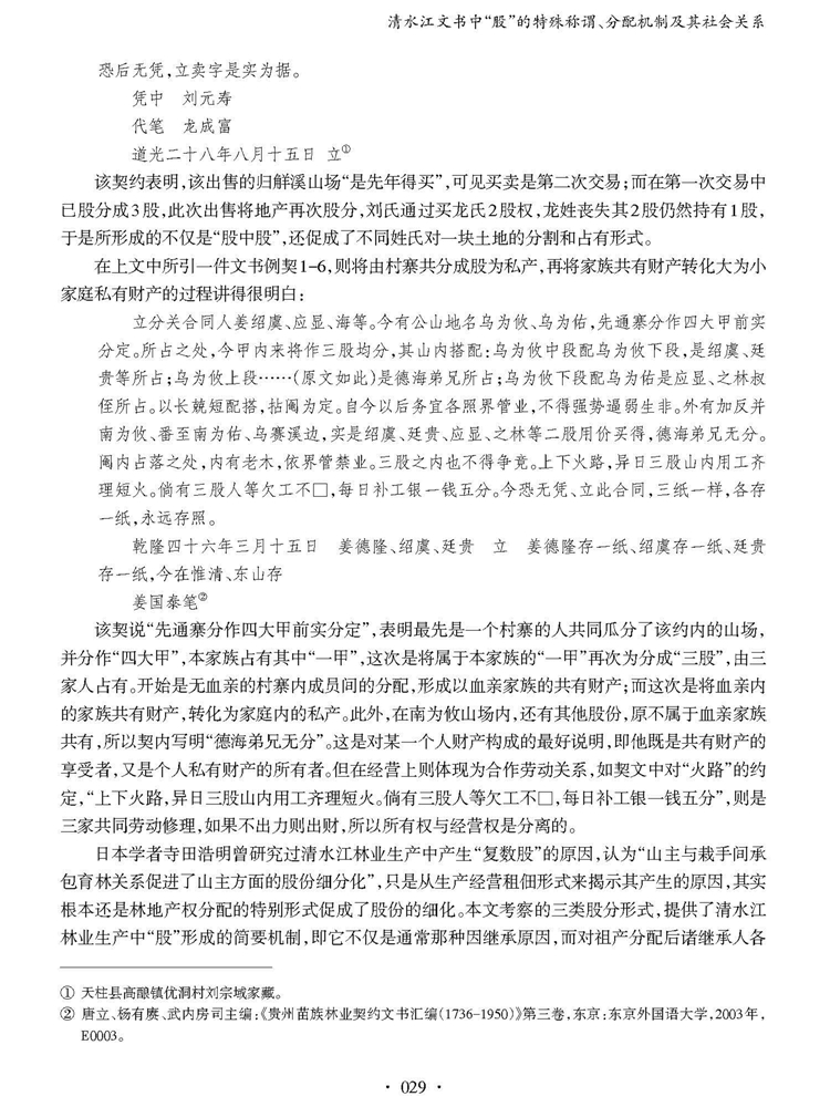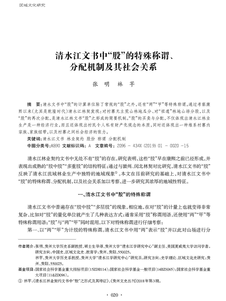 2019年第1期《地域文化研究》刊载贵州大学历史系副教授、贵州大学“清水江学研究中心”副主任张明,贵州大学历史系教授、贵州大学“清水江学研究中心”研究员林芊国家社会科学基金重大招标项目(15ZDB114)、国家社会科学基金一般项目(14BZS065)、国家社会科学基金重大项目(11&ZD096)研究成果,题:清水江文书中“股”的特殊称谓、分配机制及其社会关系。全文如下: