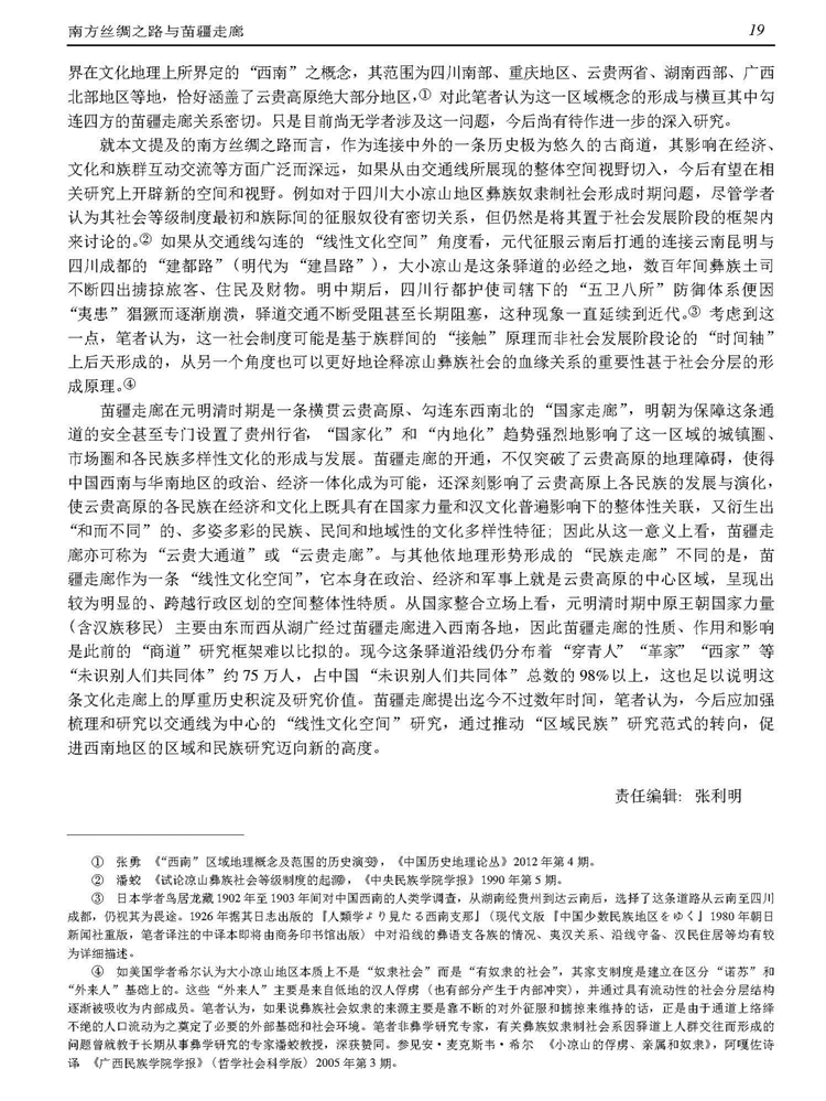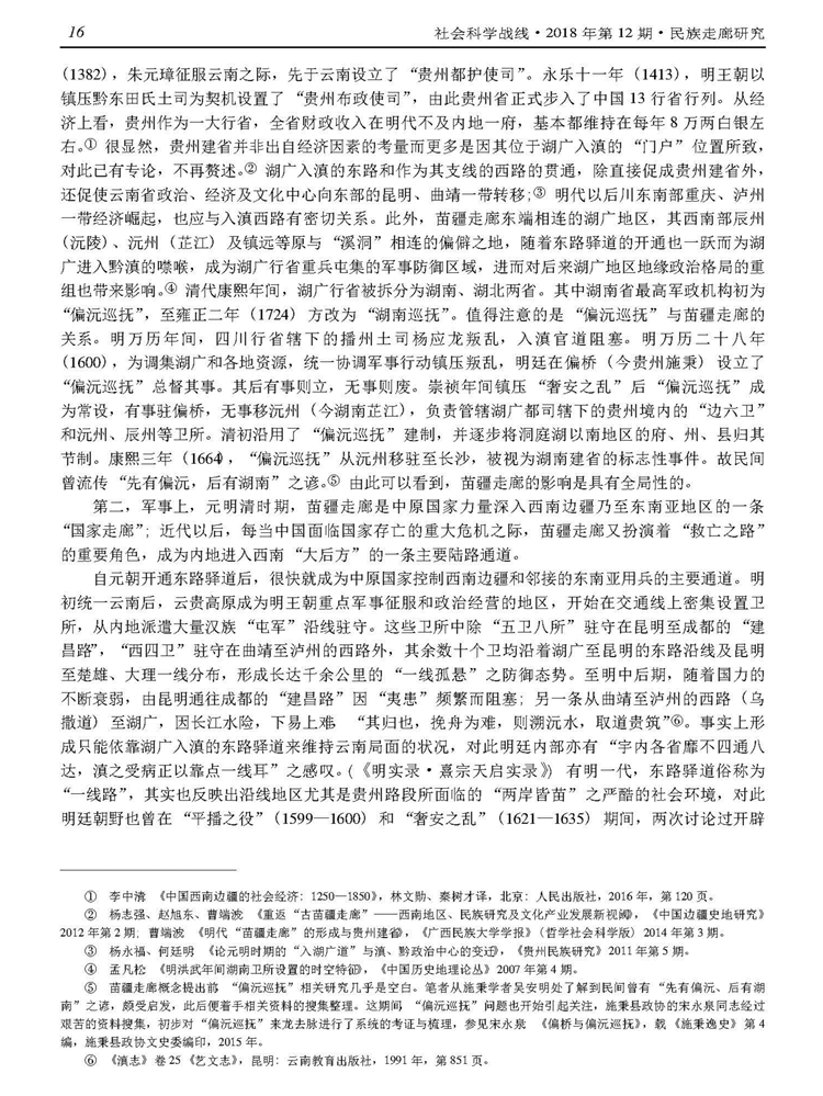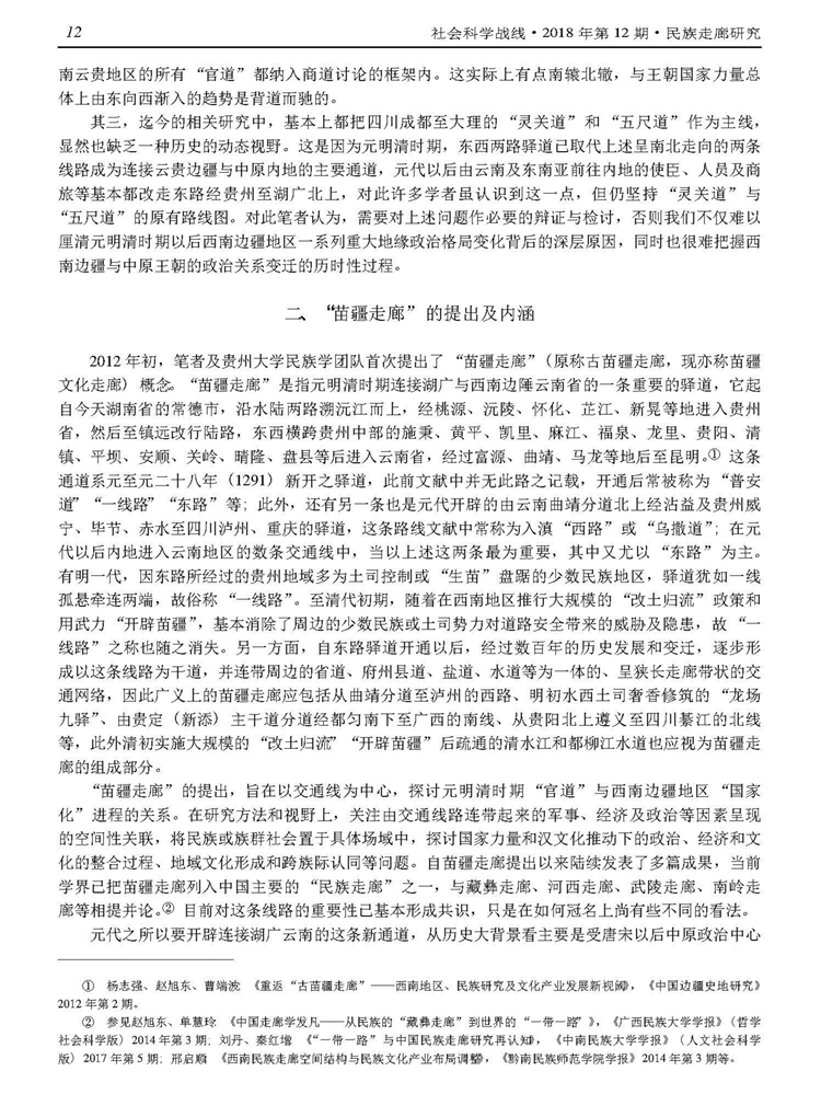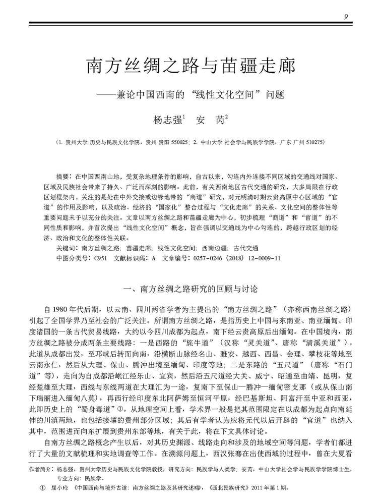 2018年第12期《社会科学战线》刊载贵州大学历史与民族文化学院教授、贵州大学中华传统文化与贵州地域文化研究中心研究员杨志强以及中山大学社会学与民族学学院博士生安芮论文,题:南方丝绸之路与苗疆走廊——兼论中国西南的“线性文化空间”问题。全文如下: