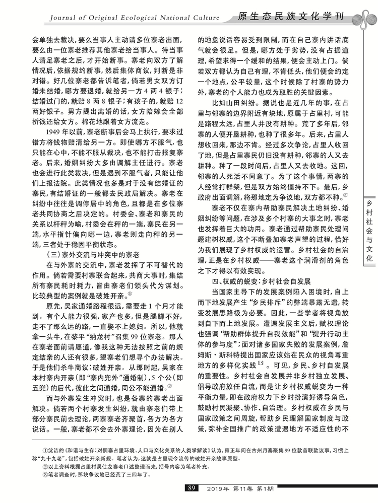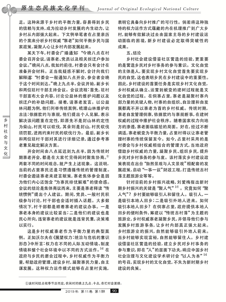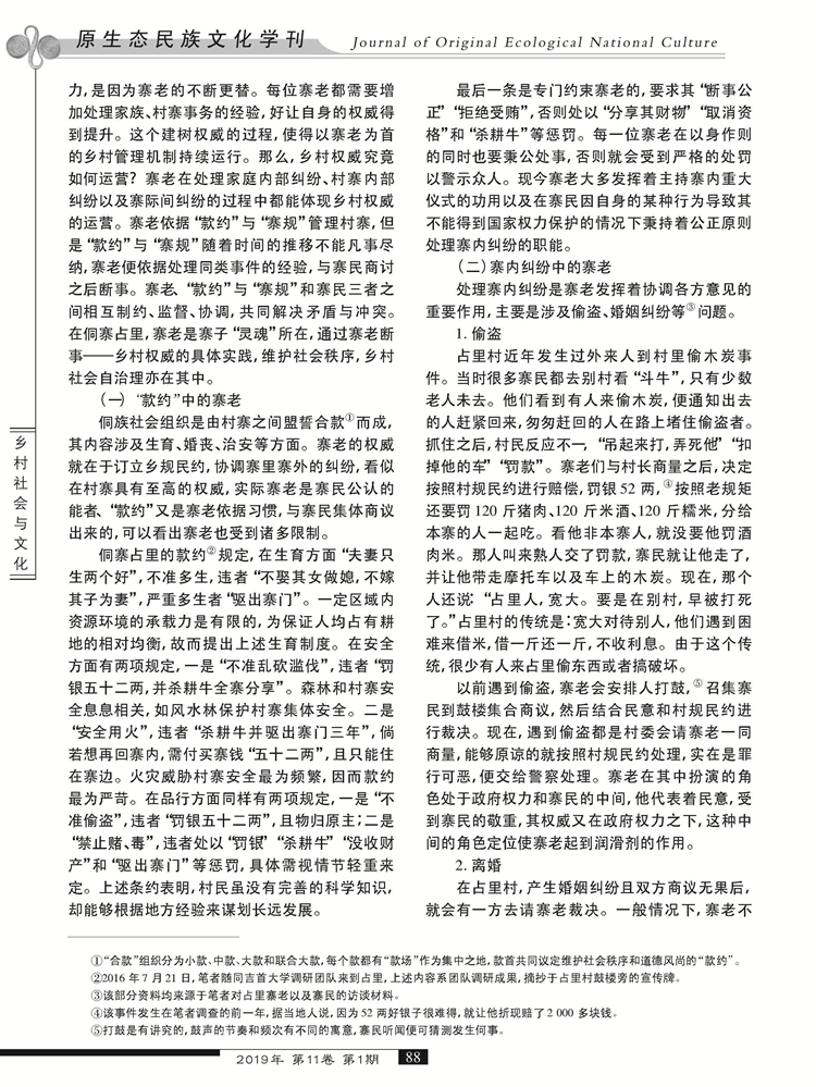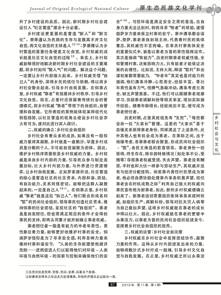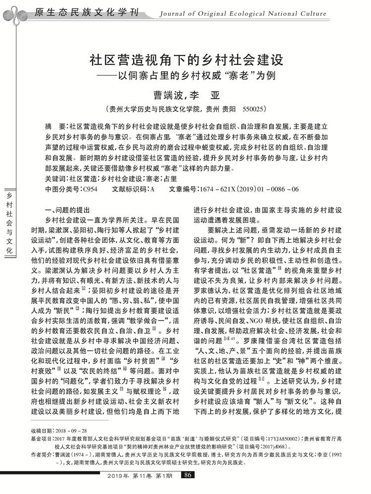 2019年第1期《原生态民族文化学刊》刊载贵州大学历史与民族文化学院教授、贵州大学中华传统文化与贵州地域文化研究中心研究员曹端波,以及贵州大学历史与民族文化学院硕士研究生李亚2017年度教育部人文社会科学研究规划基金项目“苗族‘刻道’与婚姻仪式研究”(项目编号:17YJA850002)、贵州省教育厅高校人文社会科学研究基地项目“契约精神对贵州林业产业扶贫绩效的影响研究”(项目编号:2017jd068)成果,题:社区营造视角下的乡村社会建设——以侗寨占里的乡村权威“寨老”为例。全文如下: