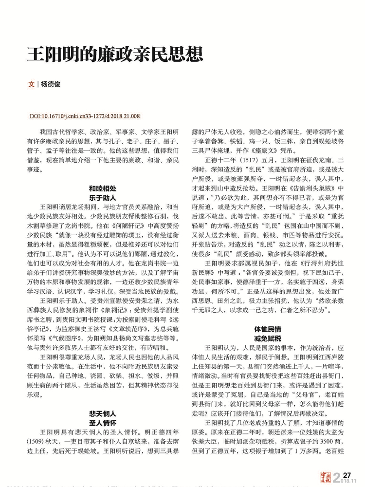 2018年第11期《宁波通讯》刊载贵州省儒学研究会副会长、修文阳明文献研究中心理事长,贵州大学中国文化书院(阳明文化研究院)暨中华传统文化与贵州地域文化研究中心特聘兼职研究员杨德俊先生文章,题:王阳明的廉政亲民思想。全文如下: