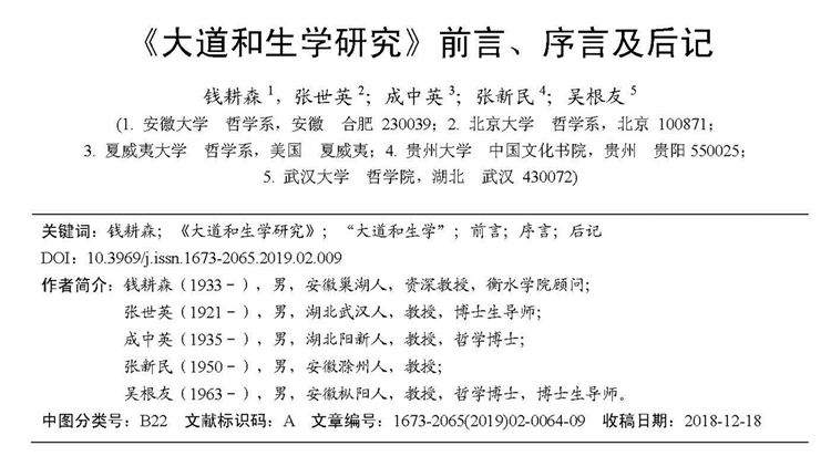 2019年4月第2期《衡水学院学报》刊载贵州大学中国文化书院张新民教授等“《大道和生学研究》前言、序言及后记”。其中,张新民教授“序三”全文如下: