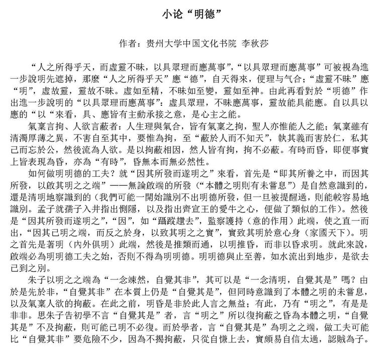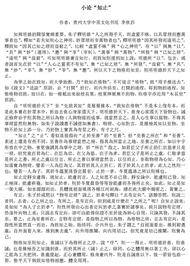 编者按:2019年3月,钦明书院己亥《大学》第一次读书月会举行。贵州大学中国文化书院教师李秋莎博士参加各场次研讨活动,在“明德”主题会上作主回应并在“知止”主题会上作主发言。相关发言稿全文如下: