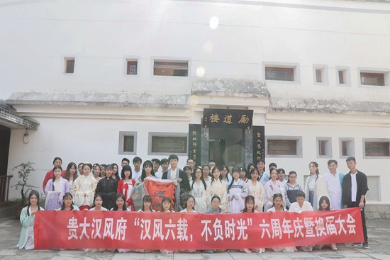 贵大新闻网讯(新闻网编辑部王思萌报道|摄影王焰)6月2日下午,我校汉风府“汉风六载,不负时光”六周年庆暨换届大会在东校区文化书院举行。此次换届大会邀请到我校小德云社、茶道社、记者团、历史文化协会等社团和学生组织及国际教育学院留学生代表,贵州财经大学知行国学社,贵州中医药大学静岚阁,贵州医科大学知行国学社参加。音乐学院任竞铭担任此次换届大会的主持人。