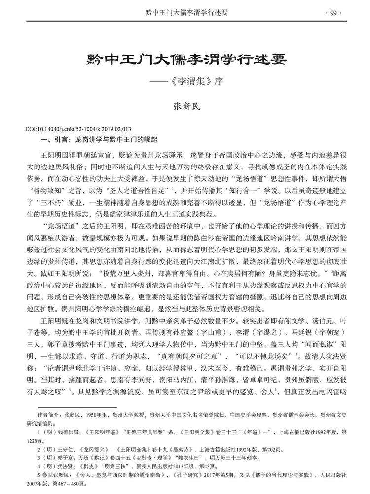 2019年第2期《贵州文史丛刊》刊载贵州大学中国文化书院荣誉院长、中国史学会理事、贵州省儒学会会长,贵州省文史研究馆馆员张新民教授文章,题:黔中王门大儒李渭学行述要——《李渭集》序。全文如下: