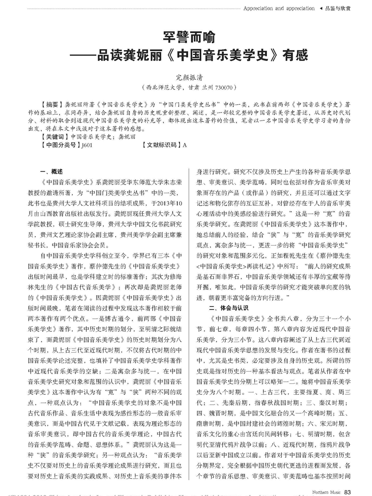 2019年第11期《北方音乐》刊载西北师范大学完颜振清所作,对贵州大学文学与传媒学院硕士研究生导师、贵州大学中国文化书院暨中华传统文化与贵州地域文化研究中心兼职研究员龚妮丽教授著作《中国音乐美学史》评论文章,题:罕譬而喻——品读龚妮丽《中国音乐美学史》有感。全文如下: