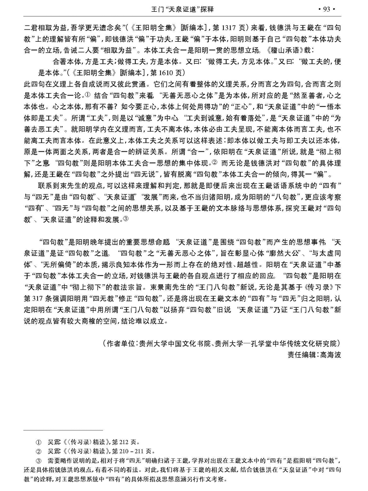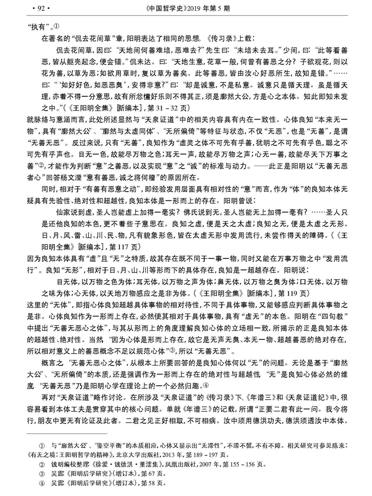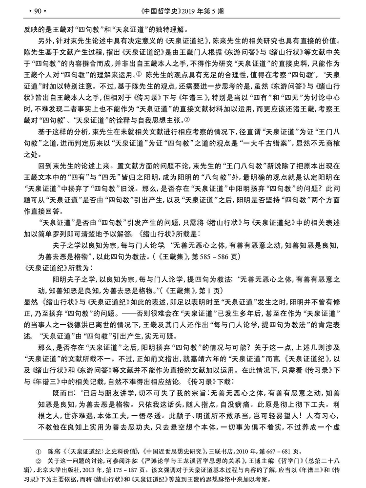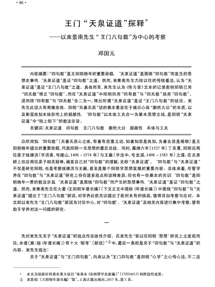 2019年第5期《中国哲学史》刊载贵州大学中国文化书院(阳明文化研究院)副教授,贵州大学-孔学堂中华传统文化研究院、贵州大学中华传统文化与贵州地域文化研究中心专职副研究员邓国元国家社科基金重大项目“多卷本《宋明理学史新编》”(17ZDA013)的阶段性成果,题:王门“天泉证道”探释——以束景南先生“王门八句教”为中心的考察。全文如下: