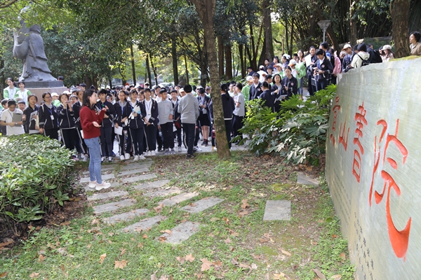 在书院大门外,同学们参观了象征中华传统文化“仁爱、正义、中正、和谐”精神的孔子铜像以及贵州文化教育开拓者尹珍先生塑像。在作为教育与历史文化符号并体现着学校发展历程的“贵山书院”石刻前,同学们细心听取了关于“贵山书院”为近代贵州教育文化事业培养出云贵地方首个状元等大批人才,以及贵州大学自“贵山书院”改制为“贵州大学堂”以来历经百年历史发展的概况介绍。