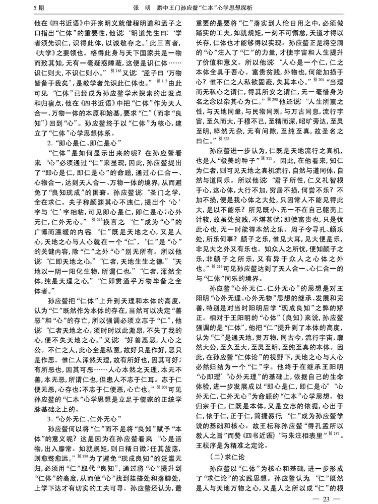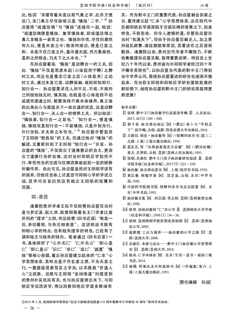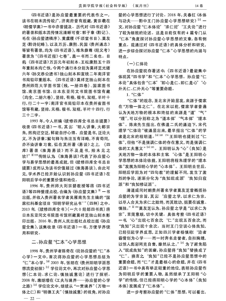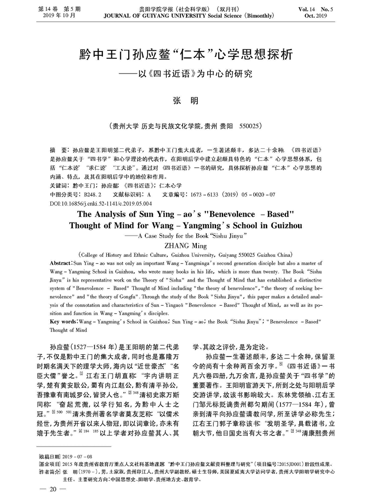 2019年10月第14卷第5期《贵阳学院学报》(社会科学版)刊载贵州大学历史与民族文化学院副教授张明2015年度贵州省教育厅人文社科基地“中华传统文化与贵州地域文化研究中心”课题“黔中王门孙应鳌文献资料整理与研究”(项目编号:2015JD001)阶段性成果,题:黔中王门孙应鳌“仁本”心学思想探析——以《四书近语》为中心的研究。全文如下: