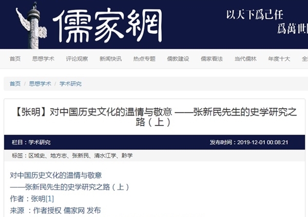 2019年12月1日“儒家网”转载贵州大学历史与民族文化学院副教授张明2019年第4期《贵州文史丛刊》对贵州大学中国文化书院荣誉院长张新民教授学术研究文章,题:对中国历史文化的温情与敬意——张新民先生的史学研究之路(上)。全文如下: