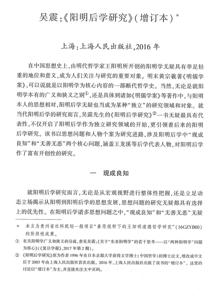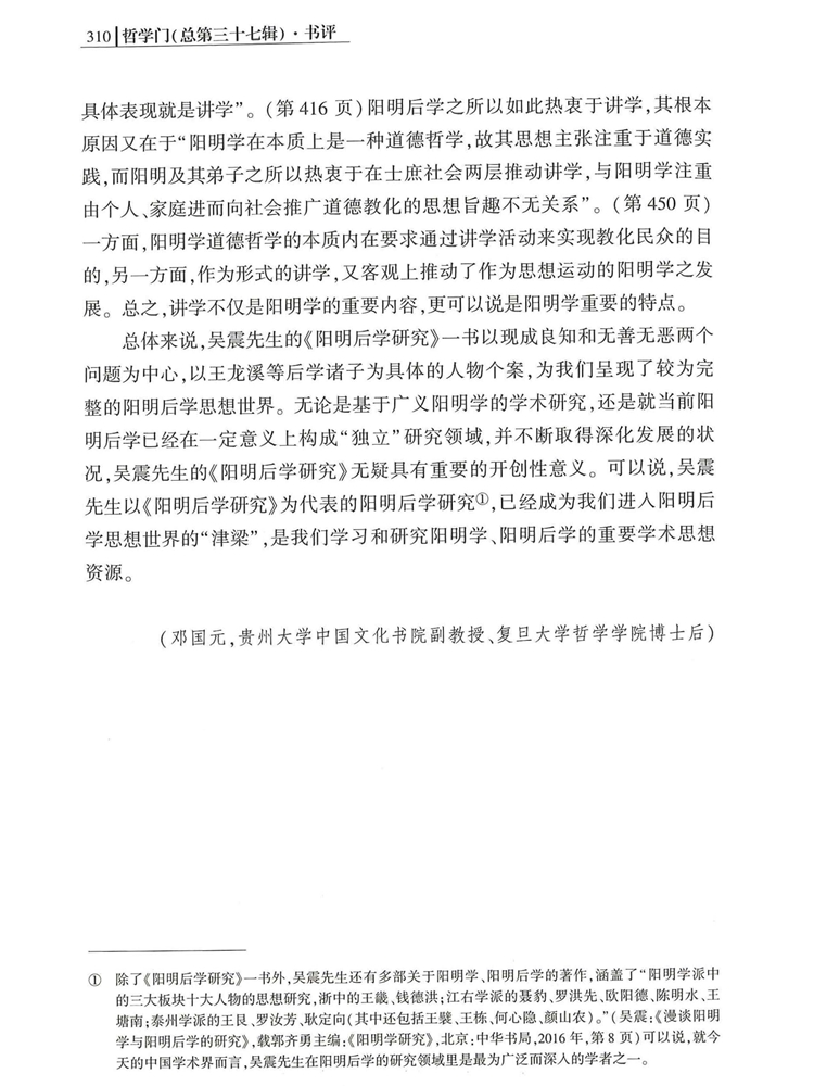 2019年3月出版的2018年第19卷第1辑(总第三十七辑)《哲学门》刊载贵州大学中国文化书院副教授、复旦大学哲学学院博士后邓国元贵州省社科规划一般项目“善恶视野下的王阳明道德哲学研究”(16GZYB60)阶段性成果,题:吴震:《阳明后学研究》(增订本)。全文如下: