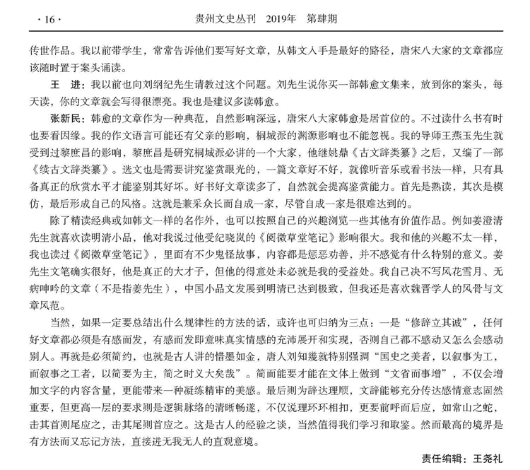 2019年第肆期《贵州文史丛刊》刊载贵州大学中国文化书院教授王胜军博士、贵州师范大学历史与政治学院教授王进博士对贵州大学中国文化书院荣誉院长张新民先生访谈录,题:博学通识是为大儒——贵州大学中国文化书院荣誉院长张新民先生访谈录。全文如下: