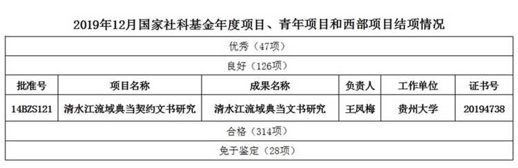 据2019年12月31日“全国哲学社会科学工作办公室”网站“2019年12月国家社科基金年度项目、青年项目和西部项目结项情况”显示,贵州大学中国文化书院副教授王凤梅国家社科项目“清水江流域典当契约文书研究”(批准号:14BZS121)以成果名称“清水江流域典当文书研究”结项获得良好(证书号:20194738)。