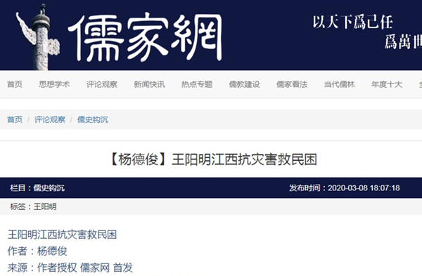 2020年3月8日“儒家网”刊载贵州省修文阳明文献研究中心理事长、贵州省儒学研究会副会长、贵州大学中国文化书院特聘兼职研究员、《龙场阳明文库》丛书主编杨德俊先生文章,题:王阳明江西抗灾害救民困。全文如下: