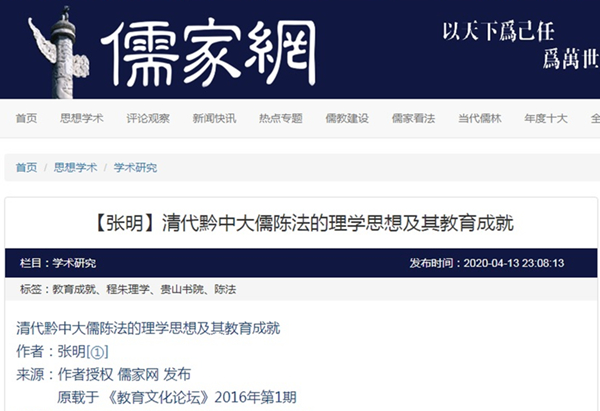 2020年4月13日“儒家网”转载贵州大学历史与民族文化学院副教授、贵州大学中华传统文化与贵州地域文化研究中心兼职研究员张明原载《教育文化论坛》2016年第1期文章,题:清代黔中大儒陈法的理学思想及其教育成就。全文如下: