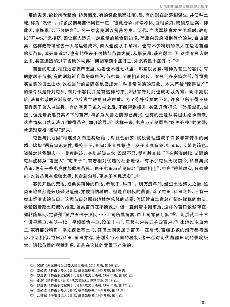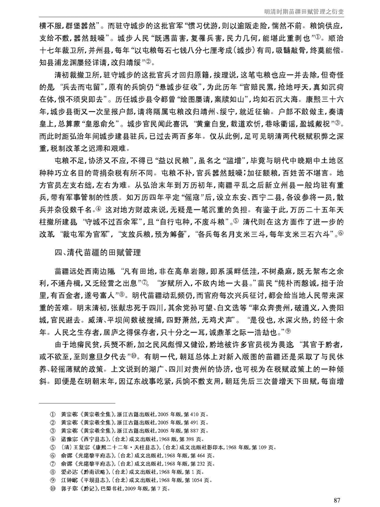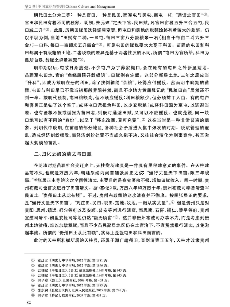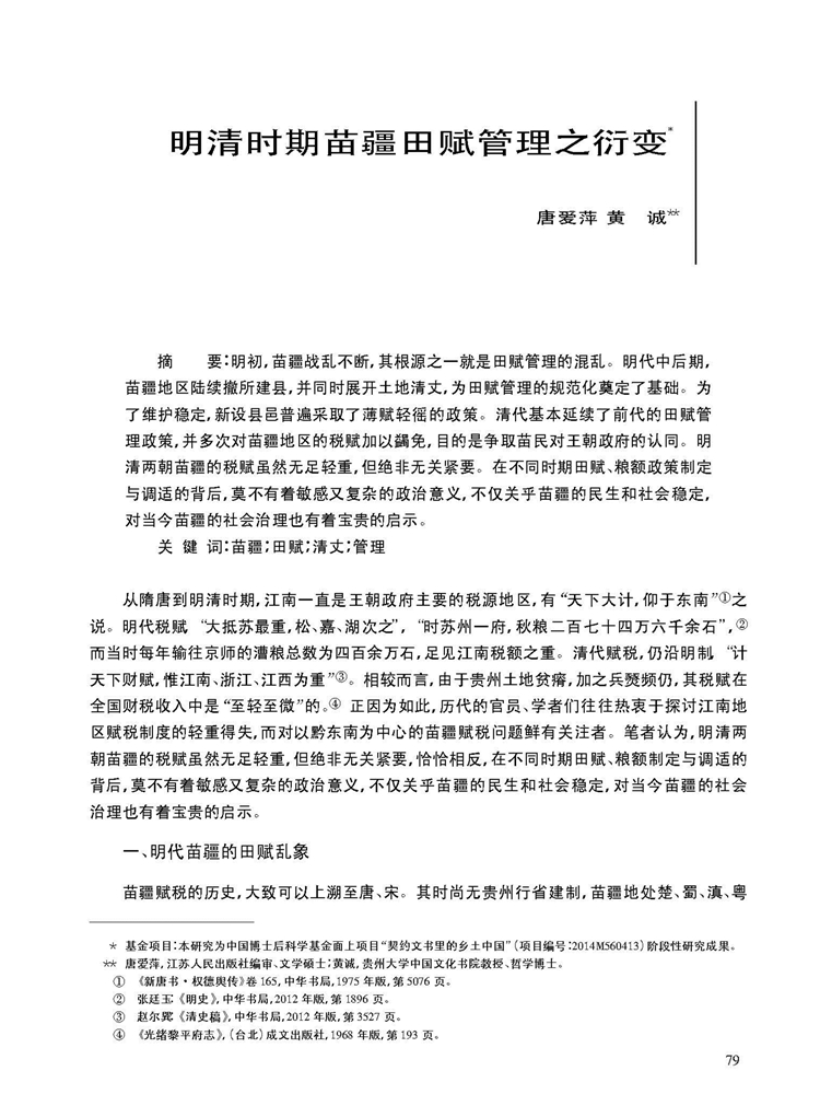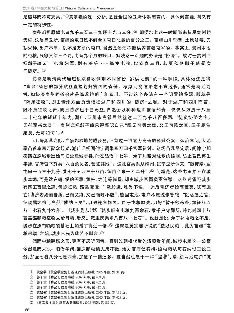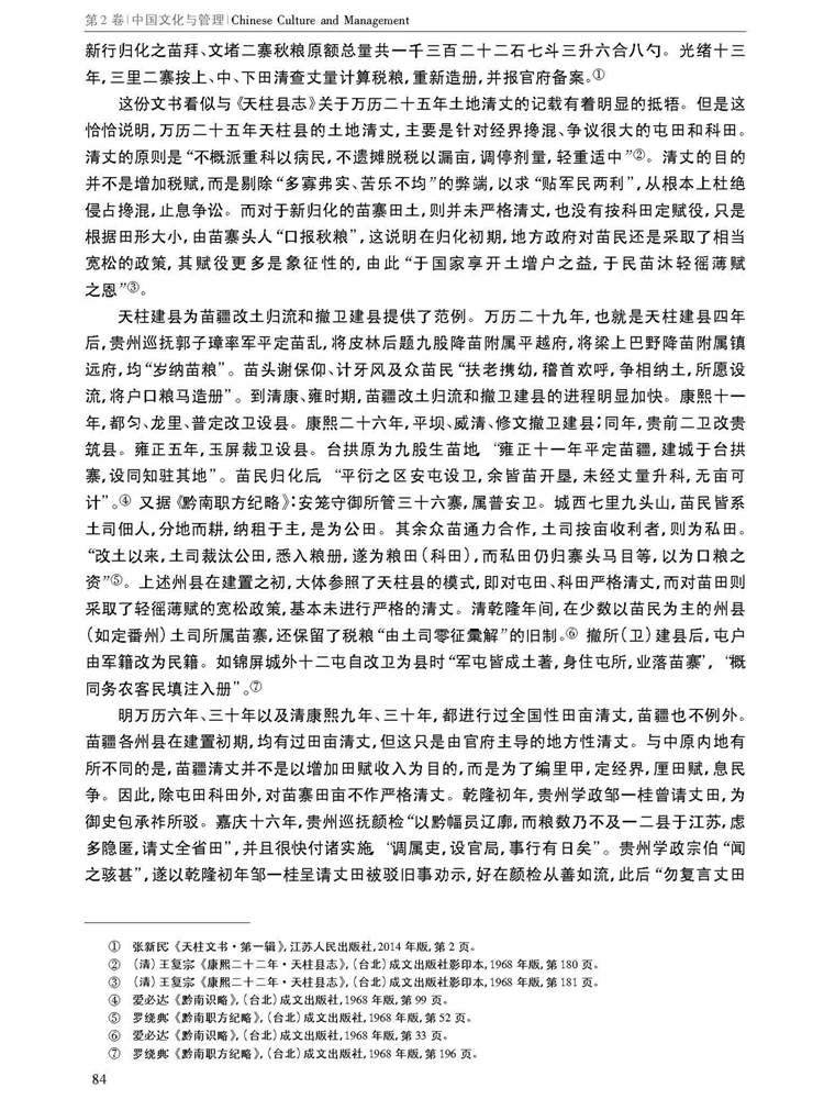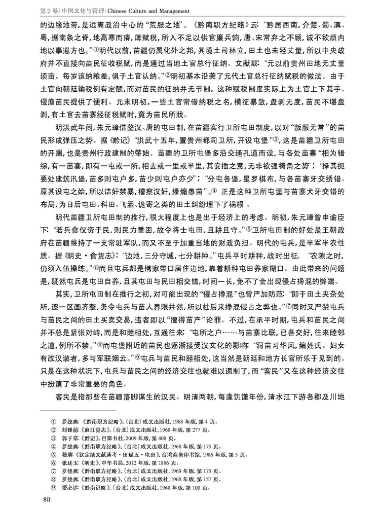 由南京大学管理学院等主办学术辑刊《中国文化与管理》(半年刊,2019年第2卷)刊载江苏人民出版社编审唐爱萍、贵州大学中国文化书院教授黄诚所著中国博士后科学基金面上项目“契约文书里的乡土中国”(项目编号:2014M560413)阶段性研究成果,题:明清时期苗疆田赋管理之衍变。全文如下:
