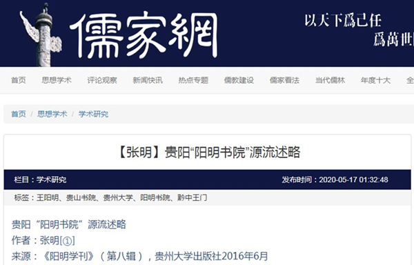 2020年5月17日“儒家网”转载刊出贵州大学中国文化书院(阳明文化研究院)、贵州大学中华传统文化与贵州地域文化研究中心所主办学术辑刊《阳明学刊》(第八辑,贵州大学出版社2016年6月)所载,现贵州大学历史与民族文化学院副教授、贵州大学中华传统文化与贵州地域文化研究中心兼职副研究员、贵州大学阳明学研究中心主任、贵州省阳明学学会副秘书长张明所撰贵州大学人文社科项目“王阳明与黔中王门研究”[批号:GDYB2010014]文章,题:贵阳“阳明书院”源流述略。全文如下: