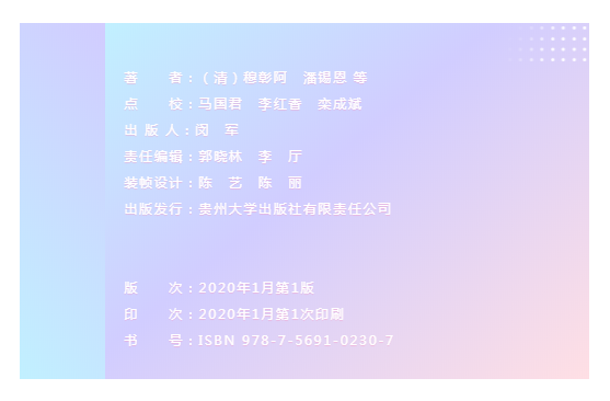 点校者马国君,博士,贵州大学历史与民族文化学院教授,贵州省哲学社会科学学术带头人,中组部“西部之光”高级访问学者,主要从事历史地理、环境史、民族史的研究和教学,出版专著5部,在《清史研究》《思想战线》等期刊公开发表论文70余篇,独立主持完成国家社科课题、教育部课题、省长基金课题等诸类课题8项,获得省部级社会科学优秀成果奖4项。