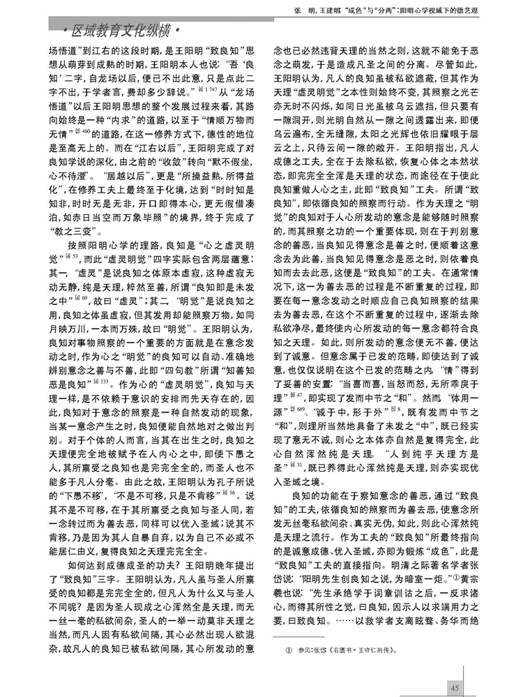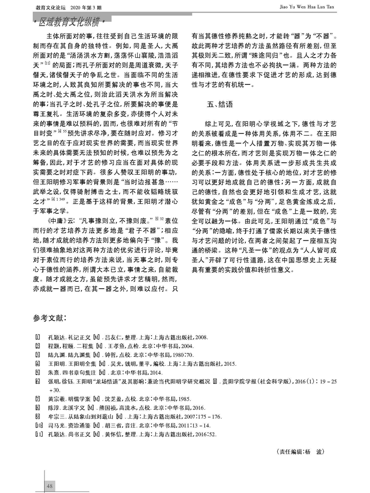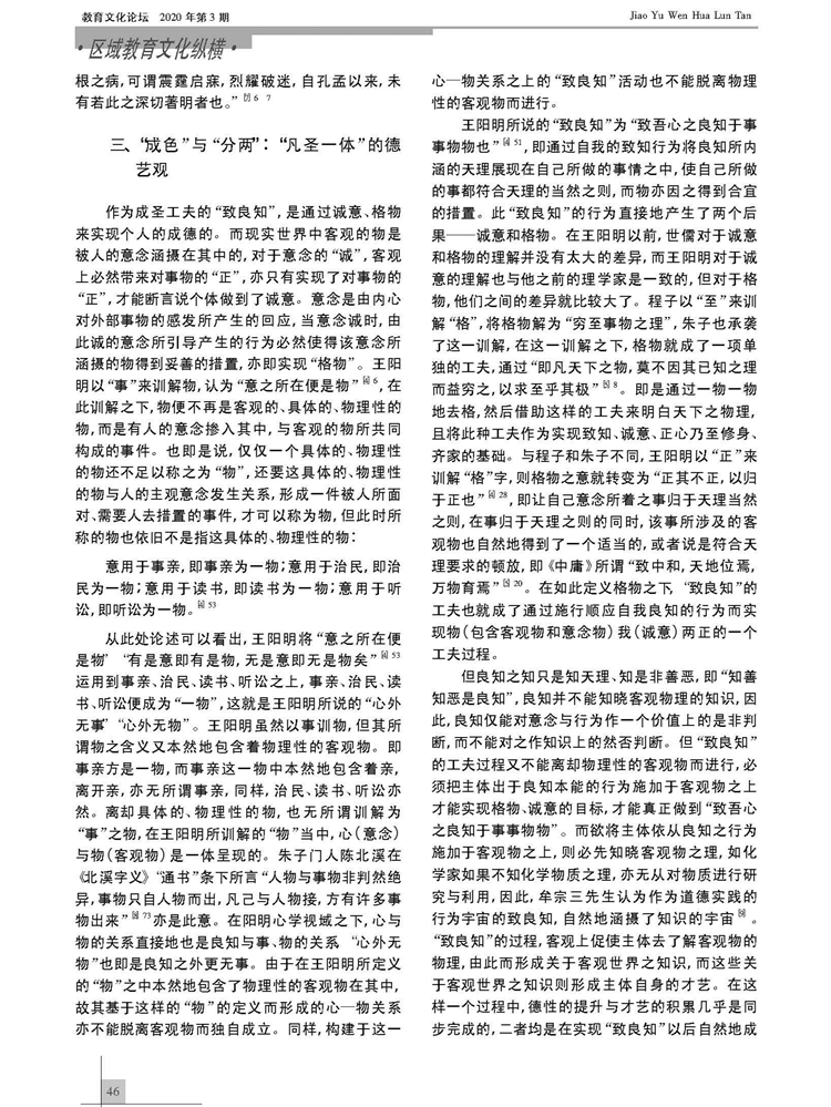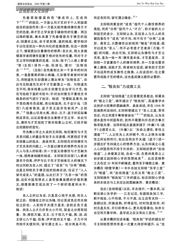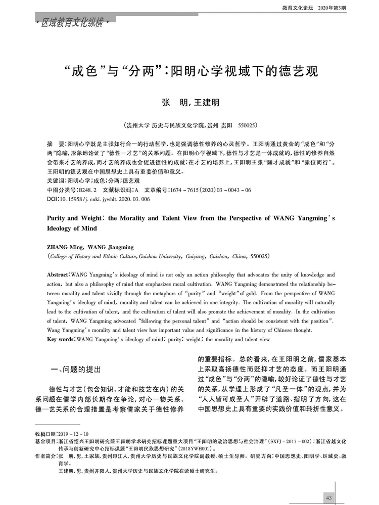 2020年第3期《教育文化论坛》刊载贵州大学历史与民族文化学院副教授、贵州大学中华传统文化与贵州地域文化研究中心兼职副研究员张明,贵州大学历史与民族文化学院在读硕士研究生王建明浙江省绍兴王阳明研究院王阳明学术研究招标课题重大项目“王阳明的政治思想与社会治理”(SXFJ-2017-002)、浙江省越文化传承与创新研究中心招标课题“王阳明民族思想研究”(2018YWH001)成果,题:“成色”与“分两”:阳明心学视域下的德艺观。全文如下: