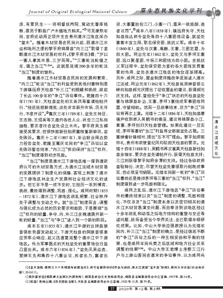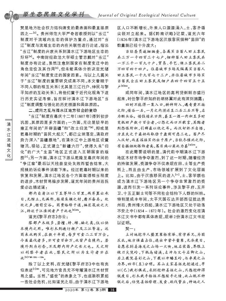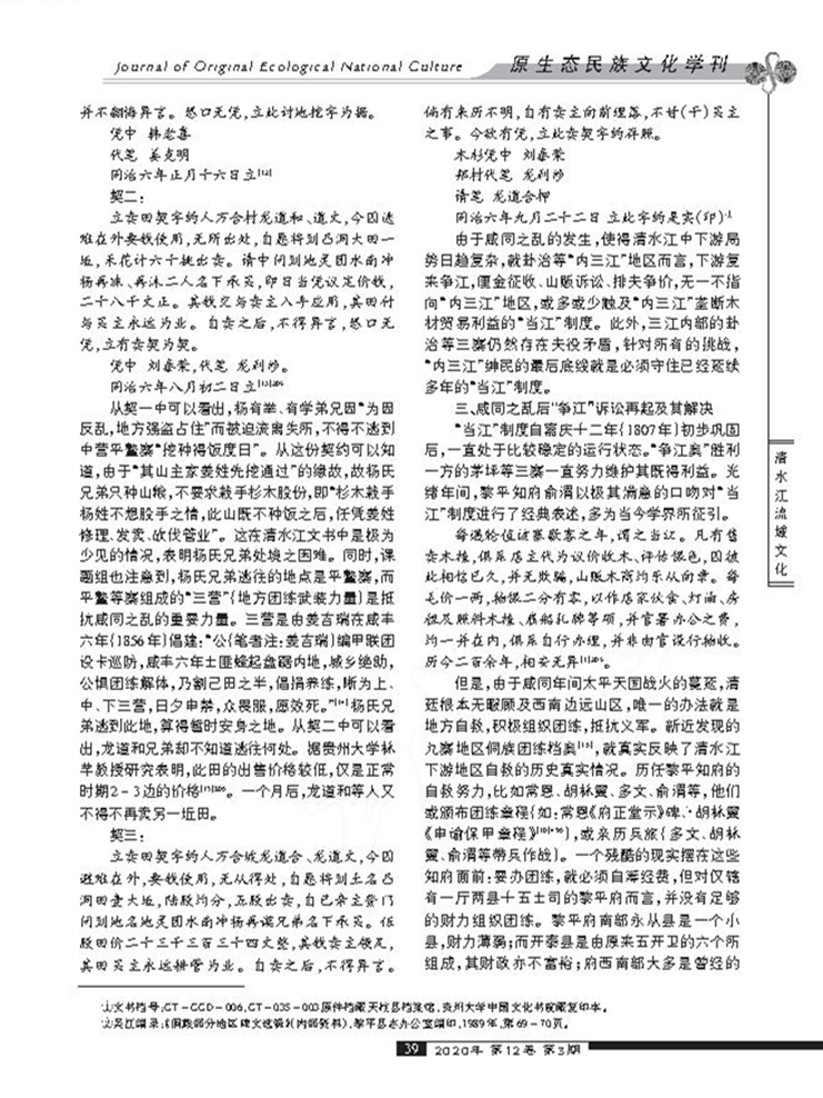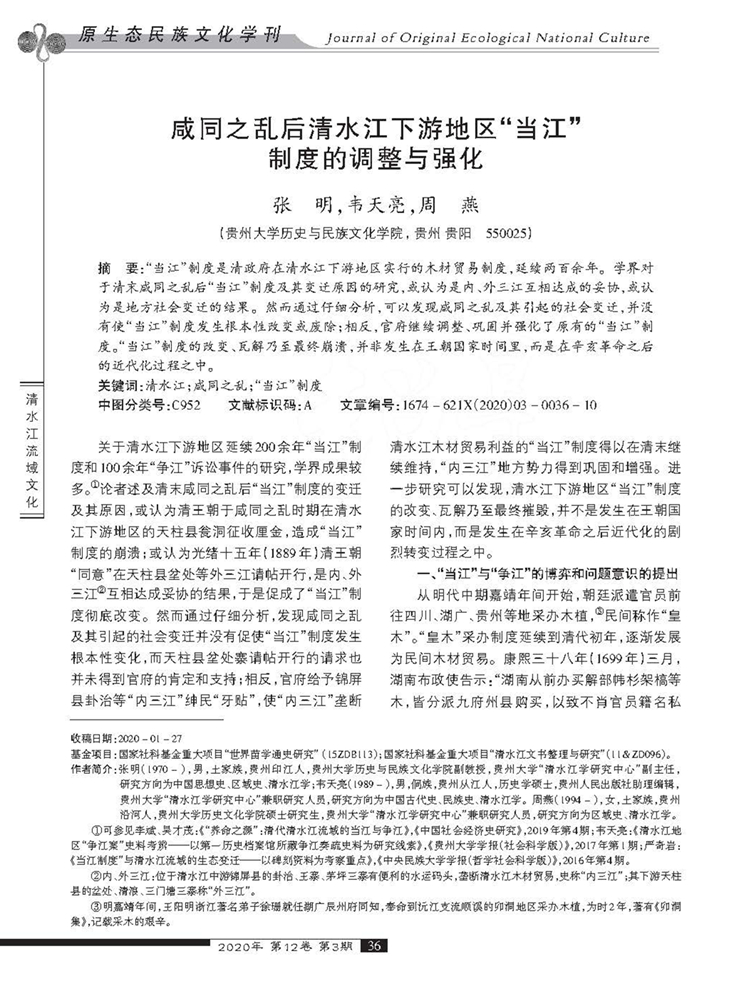 2020年第12卷第3期《原生态民族文化学刊》刊载贵州大学历史与民族文化学院副教授、贵州大学中华传统文化与贵州地域文化研究中心兼职副研究员、清水江学研究中心副主任张明,贵州人民出版社助理编辑韦天亮、贵州大学历史文化学院硕士研究生周燕国家社科基金重大项目“世界苗学通史研究”(15ZDB113)、国家社科基金重大项目“清水江文书整理与研究”(11&ZD096)成果,题:咸同之乱后清水江下游地区“当江”制度的调整与强化。全文如下: