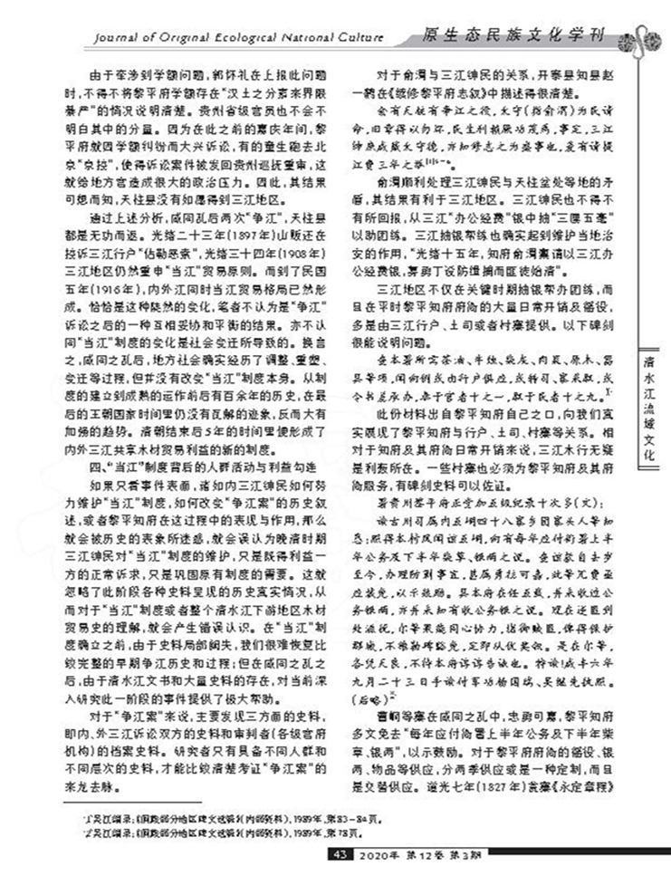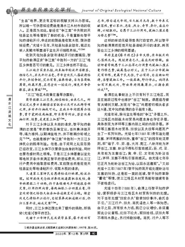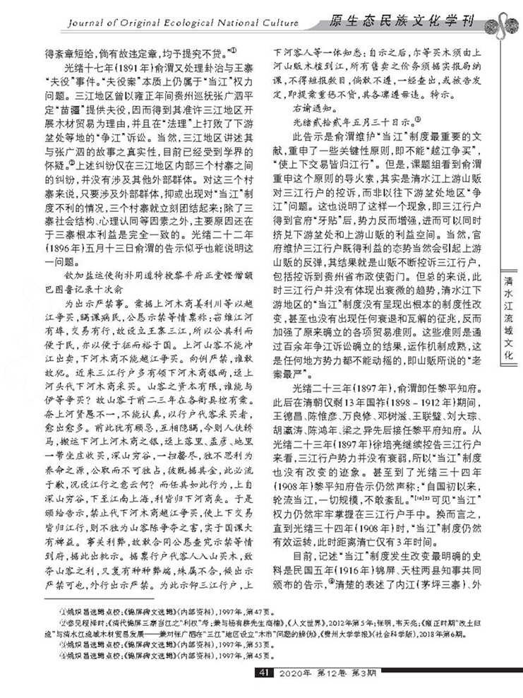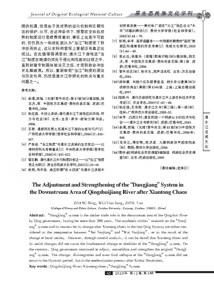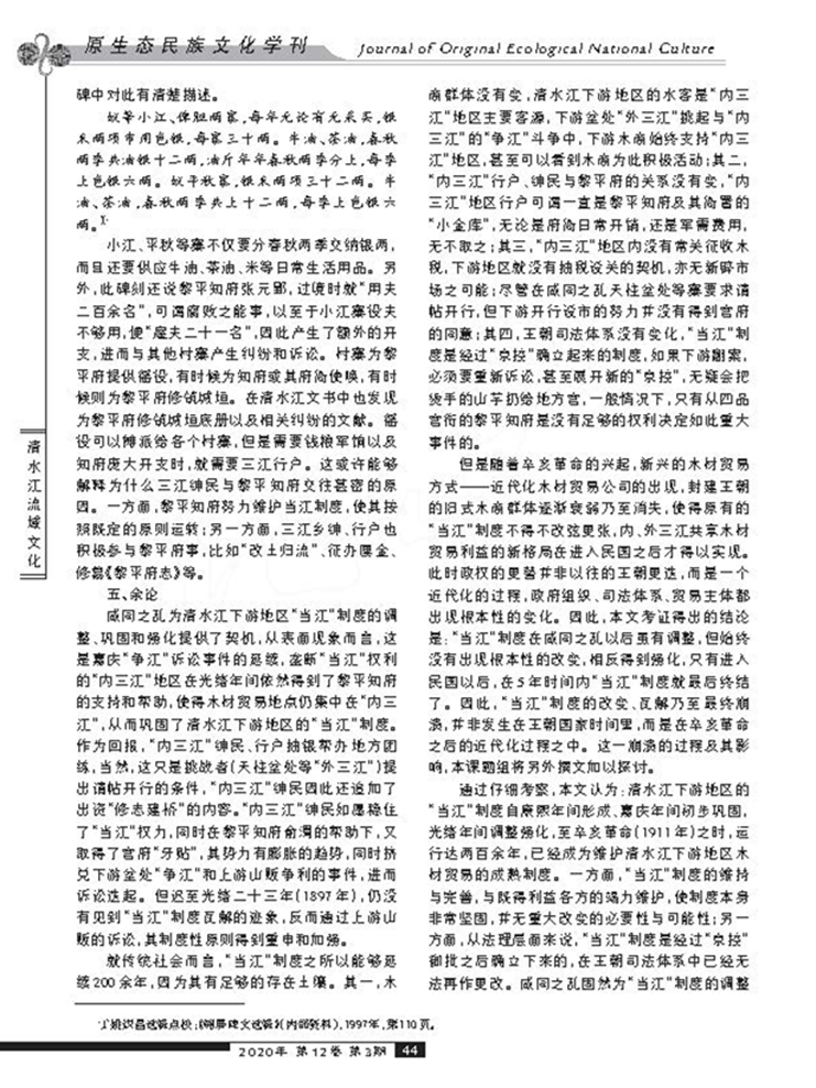 2020年第12卷第3期《原生态民族文化学刊》刊载贵州大学历史与民族文化学院副教授、贵州大学中华传统文化与贵州地域文化研究中心兼职副研究员、清水江学研究中心副主任张明,贵州人民出版社助理编辑韦天亮、贵州大学历史文化学院硕士研究生周燕国家社科基金重大项目“世界苗学通史研究”(15ZDB113)、国家社科基金重大项目“清水江文书整理与研究”(11&ZD096)成果,题:咸同之乱后清水江下游地区“当江”制度的调整与强化。全文如下: