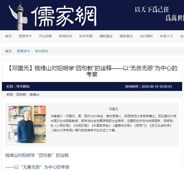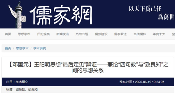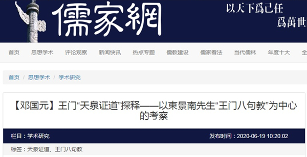 2020年6月19日,“儒家网”转载刊出贵州大学中国文化书院副教授邓国元原载《湖北大学学报(哲学社会科学版)》2020年第2期、《中国哲学史》2019年第5期、《中国哲学史》2018年第3期阳明学研究系列论文三篇。题:钱绪山对阳明学“四句教”的诠释——以“无善无恶”为中心的考察、王门“天泉证道”探释——以束景南先生“王门八句教”为中心的考察、王阳明思想“最后定见”辨证——兼论“四句教”与“致良知”之间的思想关系。