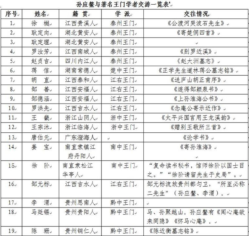 孙应鳌广交天下王门学者,磨砺学问气节,终成一代“名臣大儒”。“平生难进易退,任事敢言,不以依违徇人,亦不以激烈取异;物来顺应,沛然有余。其时海内群以名臣大儒推之”。江右学者胡直(庐山)将其列为天下四大“正学贤人”之一:“宇内讲明正学,楚有黄安耿公,蜀有内江赵公,黔有清平孙公,吾豫章有南城罗公,皆贤人也。”四川学者任瀚以“近世豪杰”称之,并为《督学诗集》作序。以下是孙应鳌与天下王门学者交游一览表,从中可见其一生交友为学之大端。