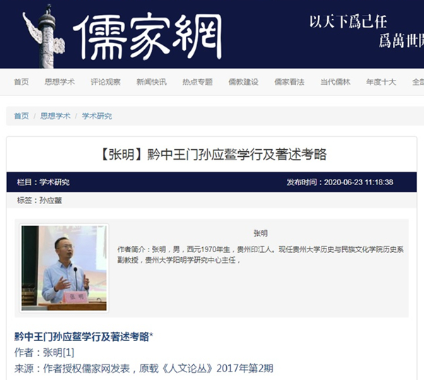 2020年6月23日,“儒家网”全文转载刊出贵州大学历史与民族文化学院历史系副教授、贵州大学阳明学研究中心主任、贵州大学中华传统文化与贵州地域文化研究中心兼职研究人员张明原载《人文论丛》2017年第2期论文,题:黔中王门孙应鳌学行及著述考略。全文如下:
