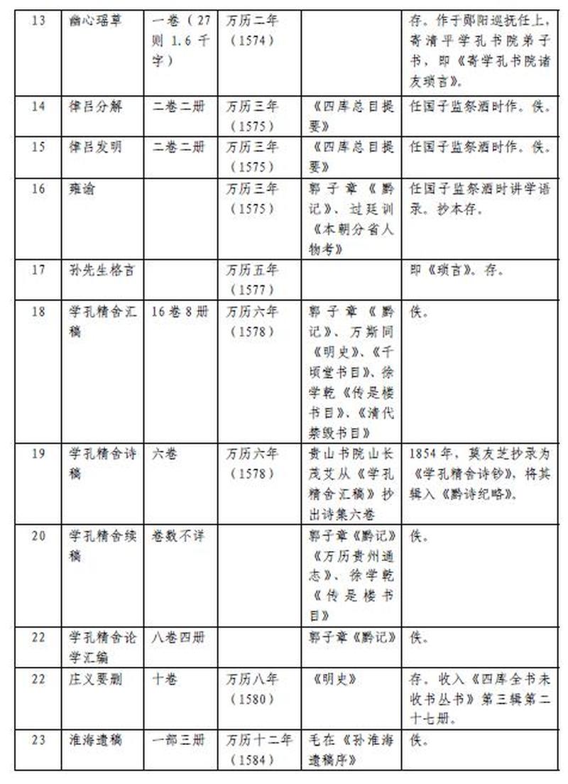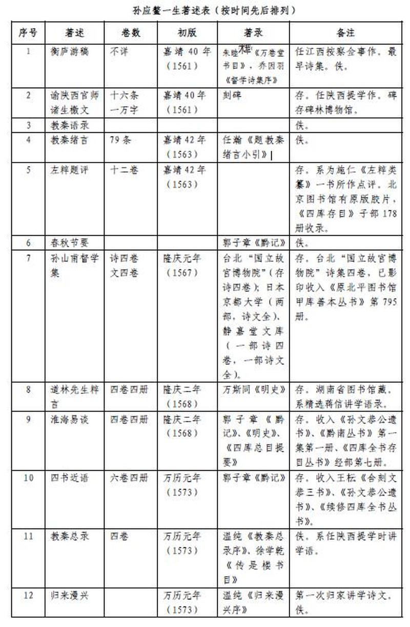 孙应鳌一生著述甚丰,可考者有24种之多,现存著述十余种,总字数达二百余万字。为简略起见,现将孙应鳌著述列表如下: