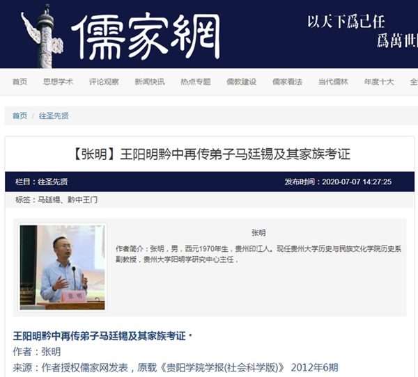 2020年7月7日“儒家网”转载贵州大学历史与民族文化学院历史系副教授、贵州大学阳明学研究中心主任、贵州大学中华传统文化与贵州地域文化研究中心兼职研究人员张明原载《贵阳学院学报(社会科学版)》2012年第6期文章,题:王阳明黔中再传弟子马廷锡及其家族考证。