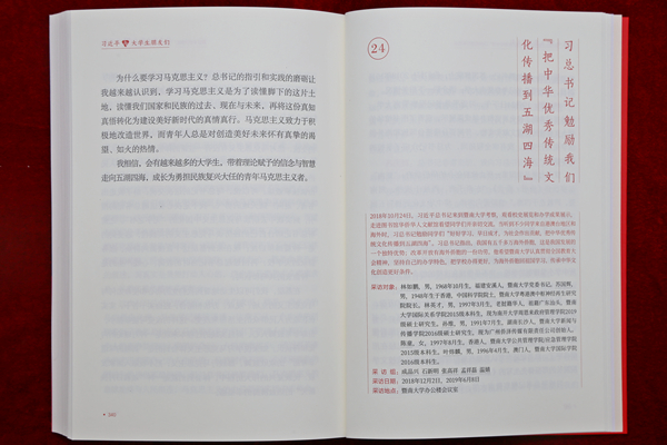 该书出版说明显示:采访实录《习近平与大学生朋友们》,从2020年五四青年节至7月底在《中国青年报》连载,受到青年读者和社会各界的广泛关注。这一系列采访实录,以“当事人讲当年事”的形式,全景展现了习近平同志在从政不同时期与青年大学生交流交心交友的故事。这些故事的时间跨度长达三十多年,涵盖习近平同志在正定、厦门、宁德、福州、浙江、上海以及到中央工作以来的各个时期,访谈对象从“60后”“70后”“80后”“90后”乃至“00后”,几乎覆盖了改革开放以来各个年龄段的大学生群体。