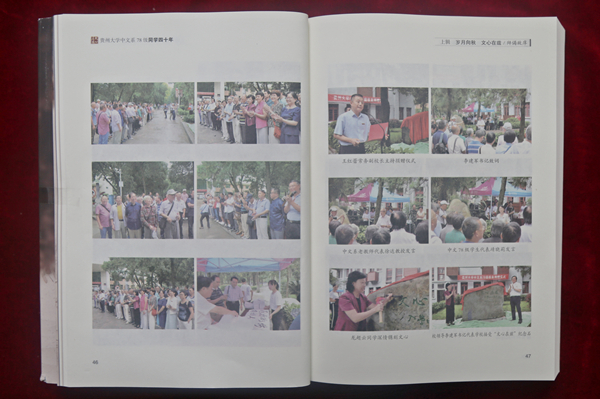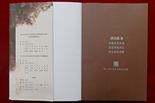 近日,贵州大学中国文化书院获赠由“文心在兹·贵州大学中文78级同学四十年”编辑委员会编印的《文心在兹·贵州大学中文系78级同学四十周年 1978-2018 图文录》。该书由龙超云任编辑委员会主任、靖晓莉任编辑组总编辑,自启动征稿至2020年11月付梓印行几近两年时间,共编入文稿200余篇,图片920余帧,计416页、18.6万字。