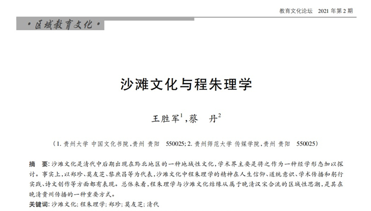 2021年第2期《教育文化论坛》刊载贵州大学中国文化书院教授王胜军博士、贵州师范大学传媒学院副教授蔡丹博士2017年度国家社科基金重大项目“多卷本《宋明理学史新编》”(17ZDA013)研究成果,题:沙滩文化与程朱理学。全文如下: