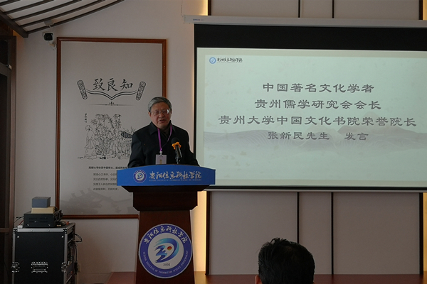 贵州省儒学研究会会长、贵州大学中国文化书院荣誉院长张新民致辞表示,王阳明在贵州龙场悟道,是王阳明个人思想与人生的转折,从而以此为基础形成了阳明心学的思想体系并成就了阳明的人生成就。同时,它又是贵州文化发展的又一重要转折,阳明及其在黔弟子所形成的“黔中王门”创立了贵州地域文化的独立学派。不仅如此,它还是中国文化发展的重要转折,开辟了阳明心学新的思想文化时代并广泛影响海外。阳明心学的核心,在于从“心即理”出发进而“知行合一”并达致“致良知”。它既是思想文化的全新创造,也是身体力行的践行之学,将“良知”从个人开始再推及整个社会。从实践的角度看,它推动个人的人生不能背离良知的轨道。同时又超越个人,关怀天下从而明明德于天下,形成社会良知的彰显。