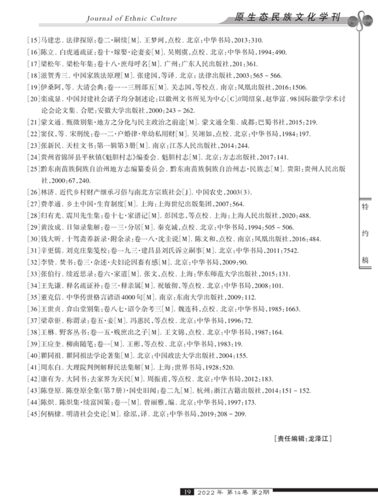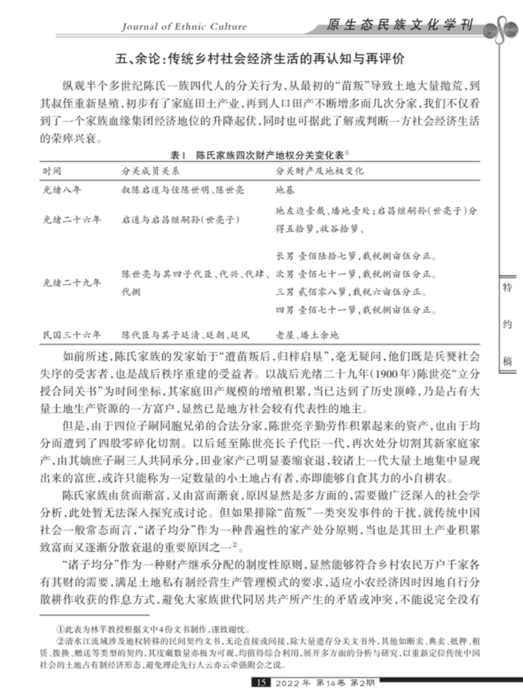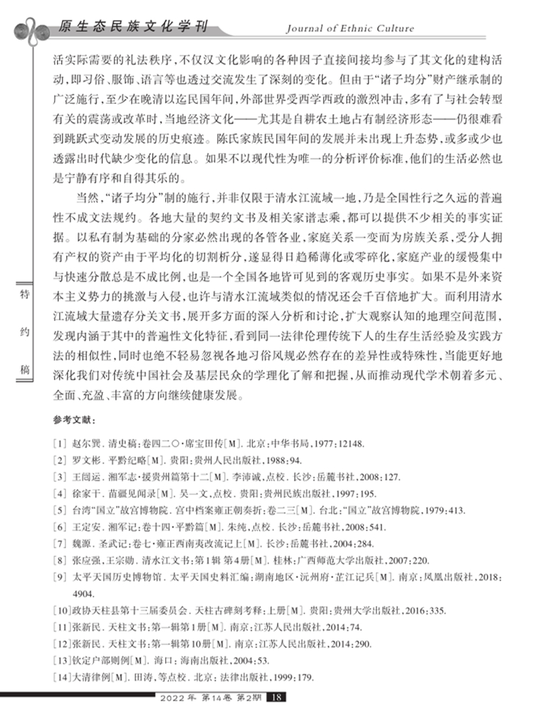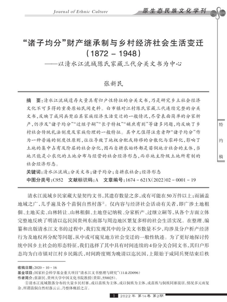 2022年第14卷第2期《原生态民族文化学刊》刊载贵州大学中国文化书院(阳明文化研究院)荣誉院长暨贵州大学中华传统文化与贵州地域文化研究中心研究人员张新民教授国家社会科学基金重大项目“清水江文书整理与研究”(11&ZD096)研究成果特约稿,题:“诸子均分”财产继承制与乡村经济社会生活变迁(1872-1948)——以清水江流域陈氏家藏三代分关文书为中心。全文如下: