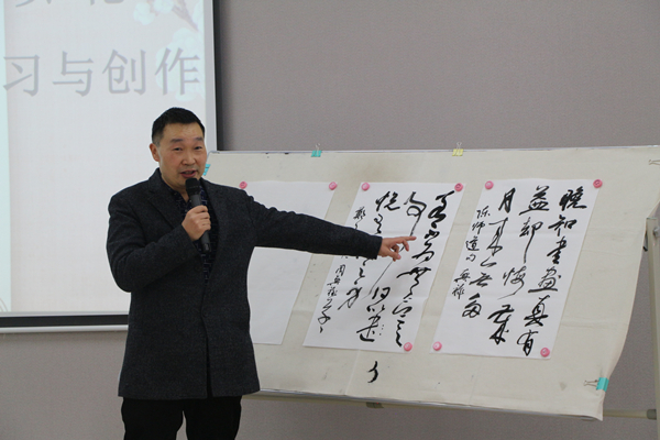 最后,周老师以自己读书、学习书法的历程,对大家做了励志教育。他以自己从没有读高中,只是读中专毕业开始工作的较低起点,先通过自学取得中、英文双本科学历,一路读到硕士、博士,最后跟欧阳中石先生做书法博士后的经历,鼓励大家下定决心,处理好各自专业学习和书法学习。他认为二者相通,学习书法重要的是要有敬业、专一的精神,最大作用是培养了自己坚持下去的恒心和毅力,这是终生受用不尽的财富。有了这种恒心和毅力,我们无论学什么专业,今后无论从事何种职业,都能取得重大成功。