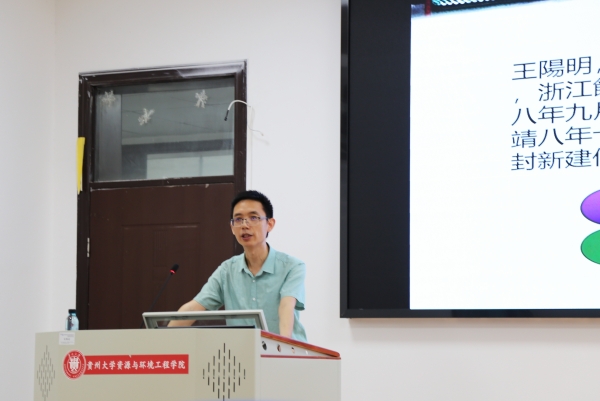 2023年8月3日上午,贵州大学中国文化书院(阳明文化研究院)教授王胜军受邀以“阳明文化与贵州”为题,在贵州大学资源与环境工程学院报告厅为来黔台湾青年学生讲授阳明文化。参加本次讲座的有中国文化大学(台湾)地理系助理教授雷鸿飞、贵州省地矿局地质灾害防治中心主任何旭东、贵州大学资环学院地质工程系副教授梁风及副教授余理娜以及中国文化大学(台湾)地理学系、地质学系本科生等。