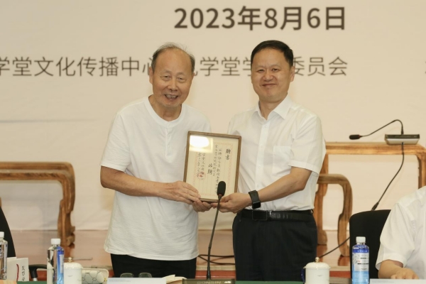 孔学堂学术委员会秘书长戴建伟(右)为郭齐勇教授(左)及所有学术委员颁发孔学堂高等研究院研究员聘书