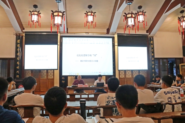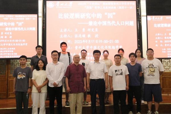 2023年9月11日晚7点,贵州大学人文社科处主办,贵州大学哲学学院、贵州大学中国文化书院、贵州大学佛教量论因明研究院承办的贵州大学“文科讲坛”第90期暨贵州大学哲学学院“国慧”哲学之光系列讲座第四十一讲在贵州大学中国文化书院勉学堂成功举办。“北大因明论坛”创始人、北京大学信息技术高等研究院数字经济研究中心高级研究员、贵州大学佛教量论因明研究院特聘教授王勇先生(笔名“疆生”)应邀主讲。讲座题目为“比较逻辑中的‘因’——兼论中国当代人口问题”,讲座由哲学学院顺真教授主持。