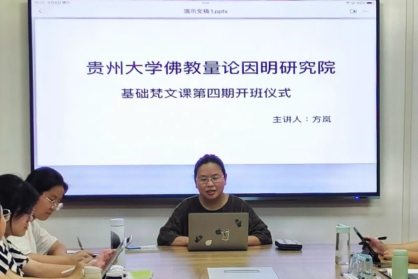 2023年9月9日19:00,贵州大学佛教量论因明研究院在东校区思贤楼208室举行基础梵文第四期开班仪式。该课程是首批国家社科基金“冷门绝学”项目(重大)——“陈那、法称因明量论原典汉语疏释与研究系列”(批准号:20VJXT011)的核心内容,由中国逻辑学会因明专委会理事、贵州大学中国文化书院副教授、贵州大学佛教量论因明研究院骨干成员——方岚老师担任主讲。此次课程吸引了哲学学院20余名本硕博学生及各高校的师生前来参与。