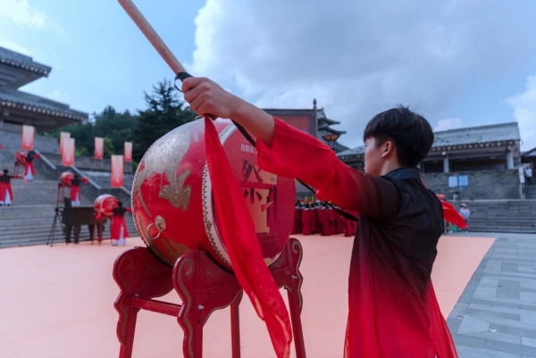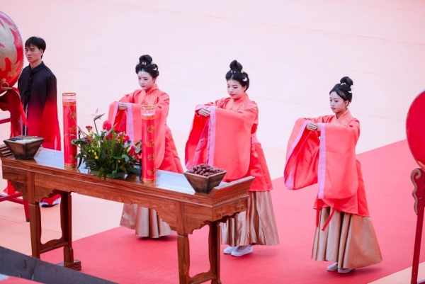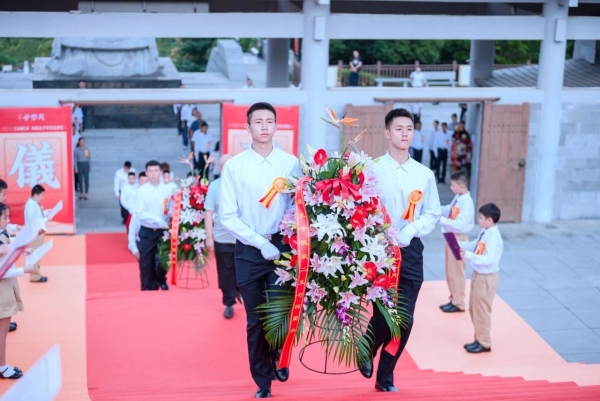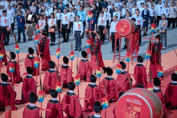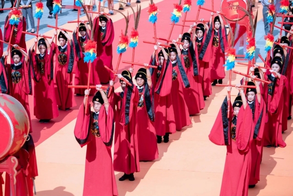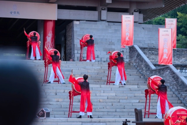 鼓乐起,声声豪迈。在庄严肃穆的氛围当中,身着传统服饰的礼仪人员,手持不同的祭品,整齐有序地走向大成殿前,向至圣先师祭奠花篮,敬献供品,表达炎黄子孙对孔子无限的敬仰和怀念之情。