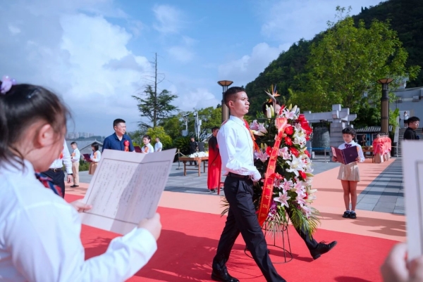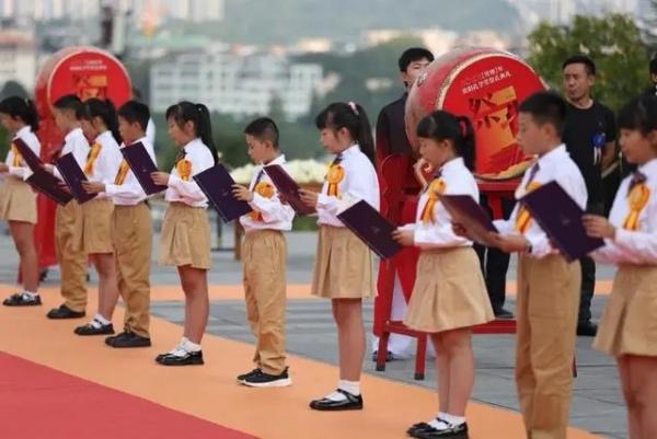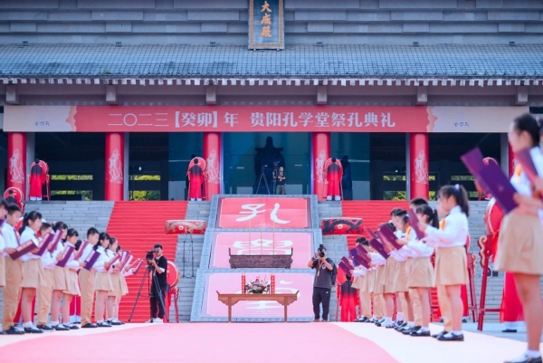 “子曰:学而时习之,不亦说乎……”。祭孔典礼正式开始后,来自贵阳市环西小学五年级的同学们齐声诵读《论语》。一声声清脆的童音饱含深情,响彻礼仪广场上空,久久回荡在每一位参礼人心中。